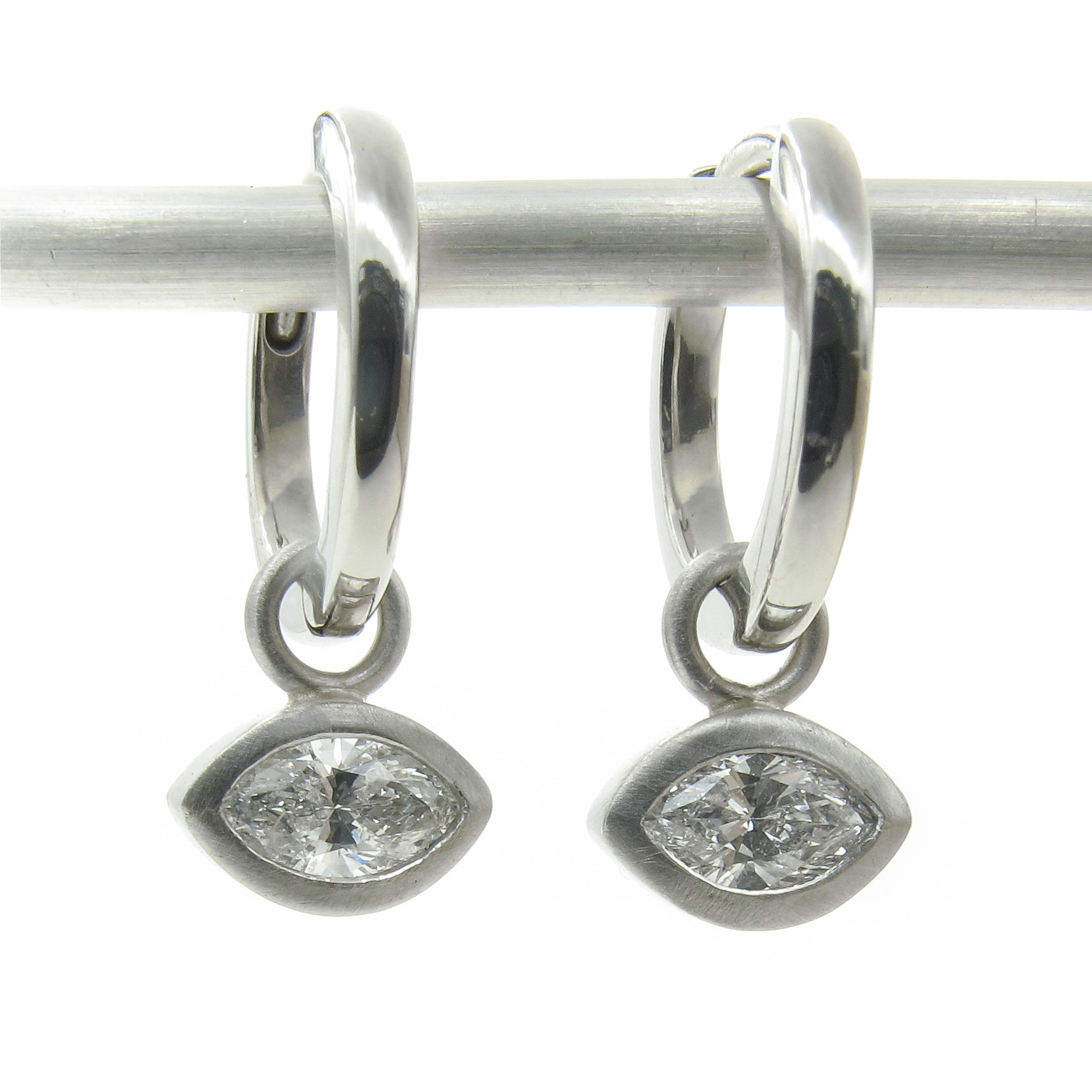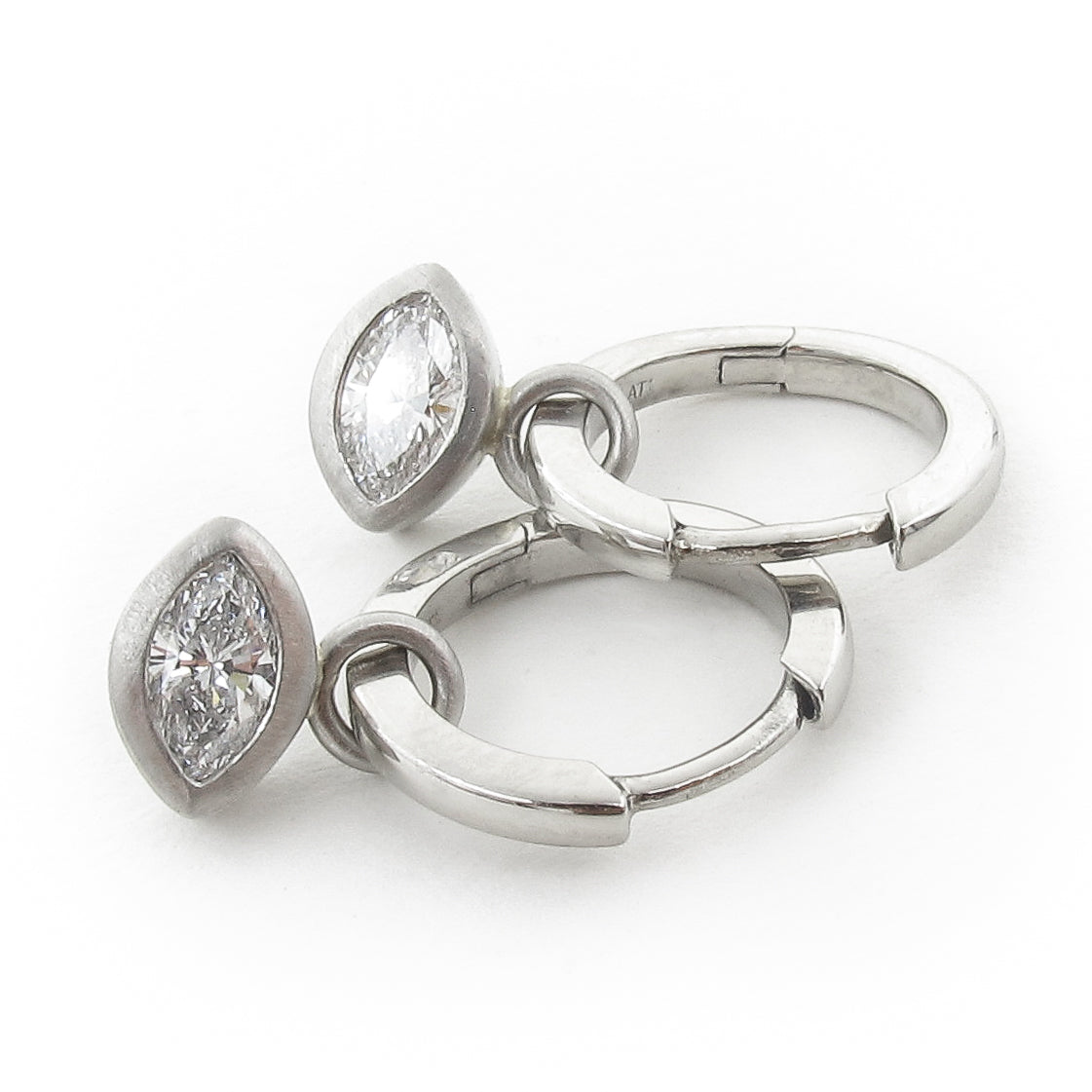 950 platinum or 14kt yellow gold huggy hoops, with .20ct marquis cut diamond drops. Hoops are 12.5mm and hinge open and closed. Wear them alone, without the diamond drops, or add some sparkle!