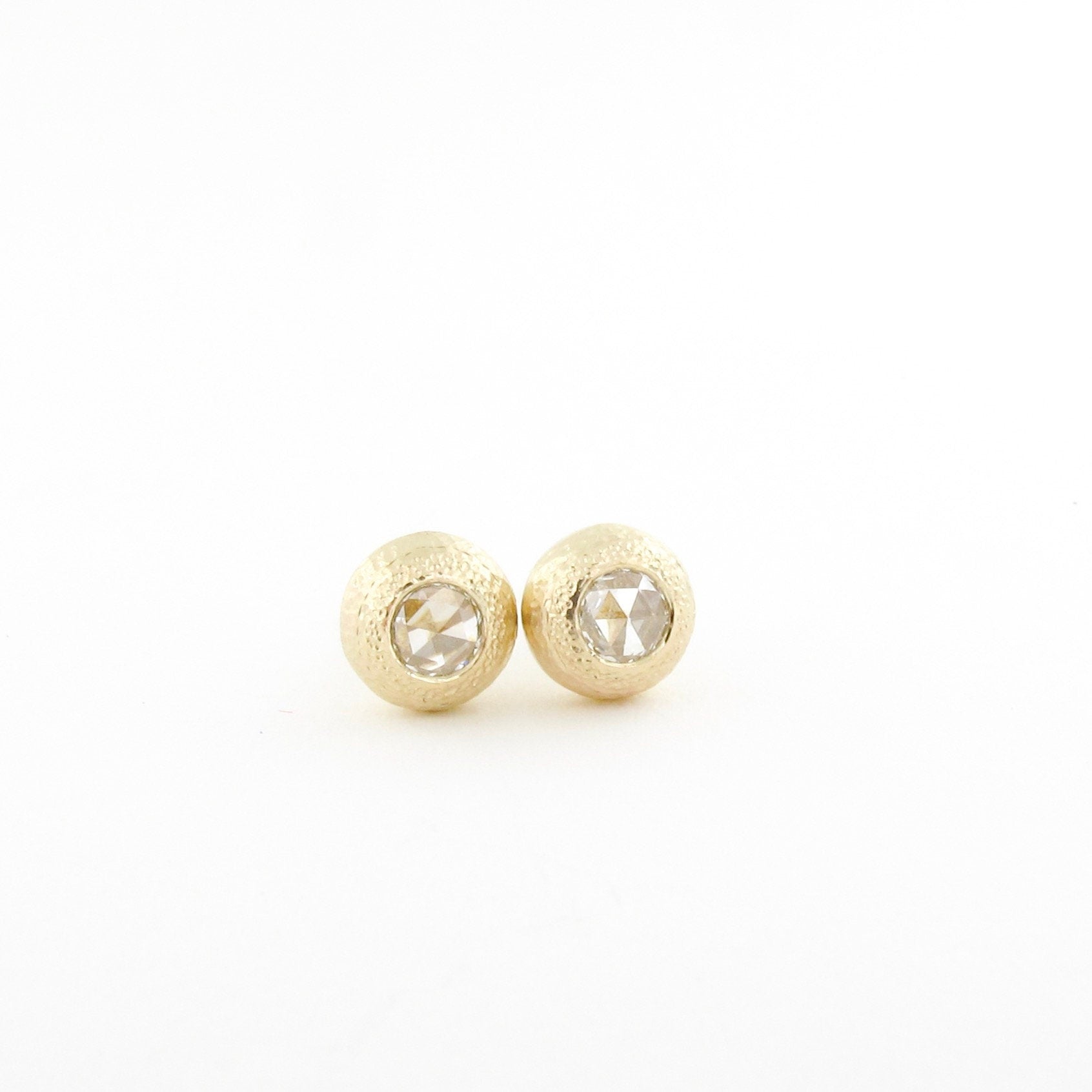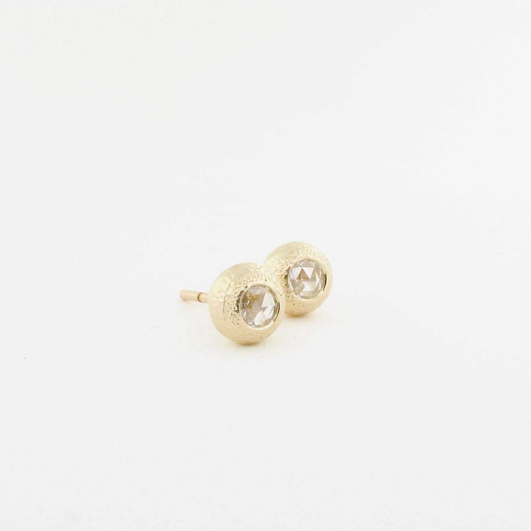 Organically textured solid gold and rose cut diamond stud earrings. Pure white rose cut diamonds wink out with big chunky sparkles from heavily textured gold bezel settings.