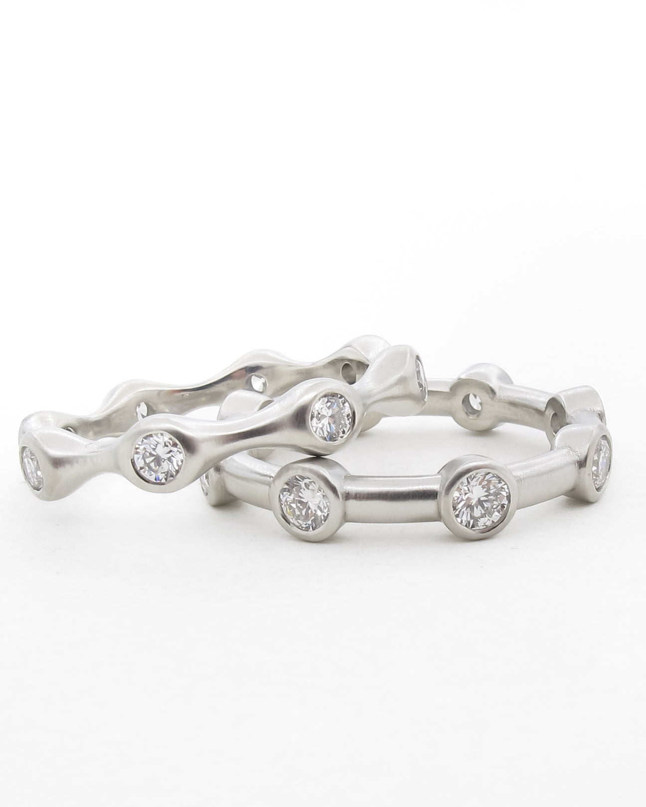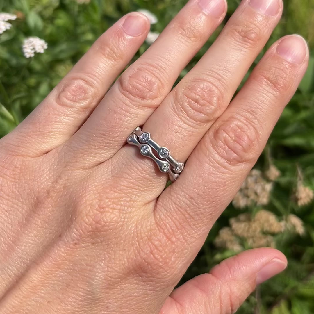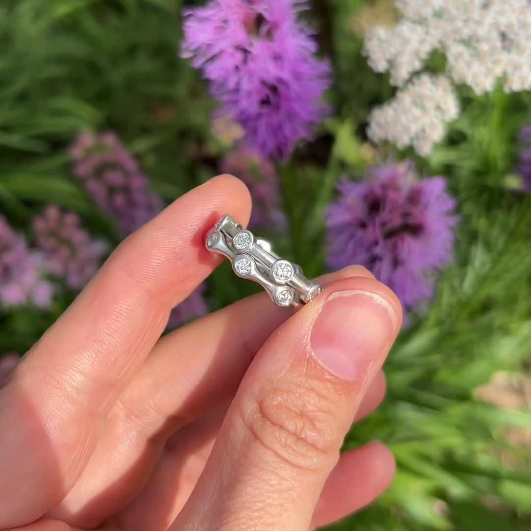 An elegant undulating eternity band crafted in satin-finished platinum or gold. This ring features a flowing, wave-like design with round brilliant diamonds bezel-set at regular intervals along the band. Each diamond is nestled within an organically shaped setting that creates a gentle rhythm around the finger. The matte metalwork contrasts beautifully with the sparkle of the diamonds, creating a contemporary yet timeless piece that could serve as either a wedding band or anniversary ring.