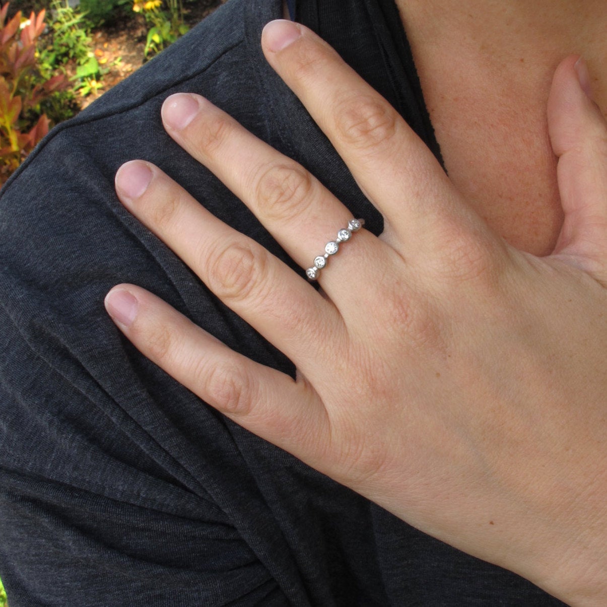 A sweet 5 stone wedding ring, with a hand carved band. The band has and angular faceted texture that tapers towards the settings. Gorgeous alone, lovely stacked with engagement rings or other bands.
