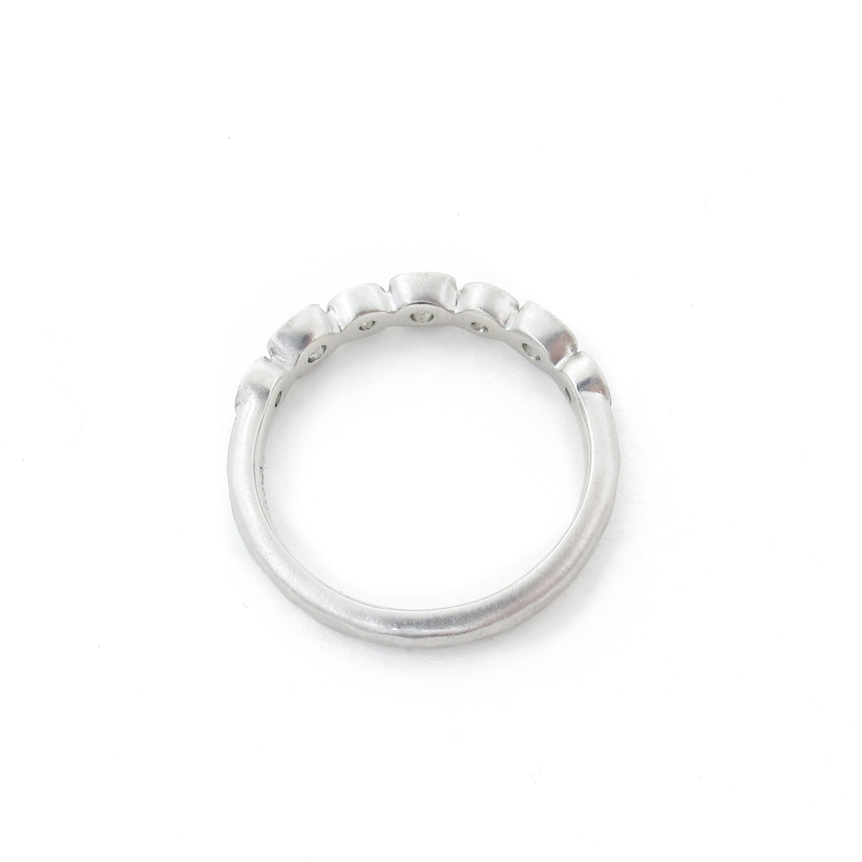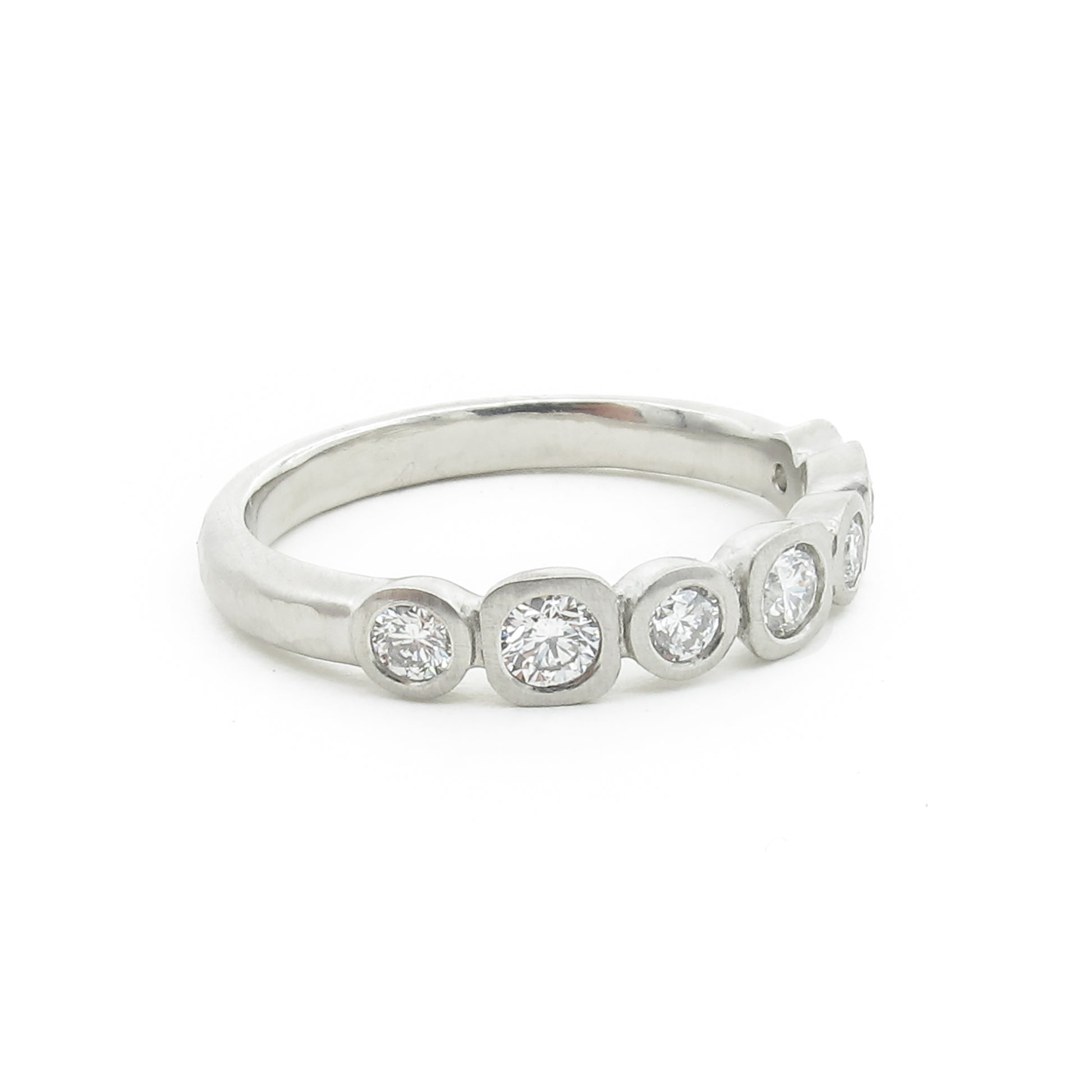 Solid precious metal and diamond bezel band. This band features round and cushion shaped alternating bezel settings. GHVS diamonds, approximately .55tcw. The band is rounded, gently textured and around 2.7mm wide.