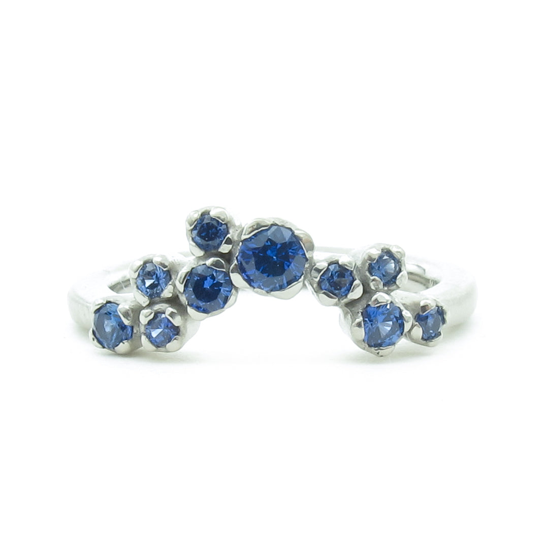 Solid platinum and Ceylon sapphire nesting band. Asymmetric sapphire cluster ring with a rising cloud of sparkling Ceylon color sapphires. Organically shaped settings hug completely clear and shimmering sapphires. Nests perfectly with a low profile solitaire engagement ring.