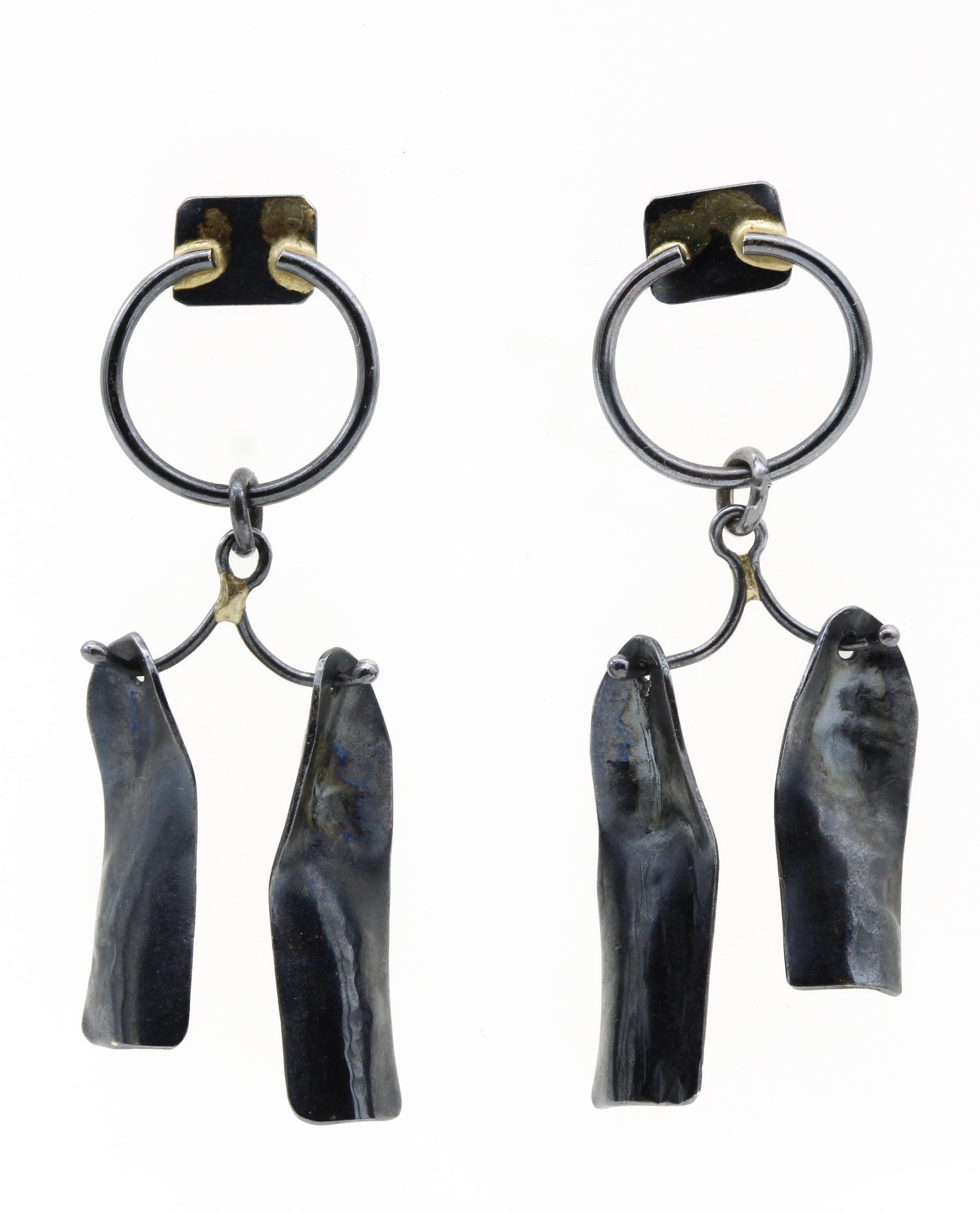 Handmade oxidized sterling silver earrings with 14kt gold accents. Double drop design with organic metal shards in deep black patina. Part of a small drop earring collection that includes the Verdigris Drop Earrings. Handmade and ready to ship.