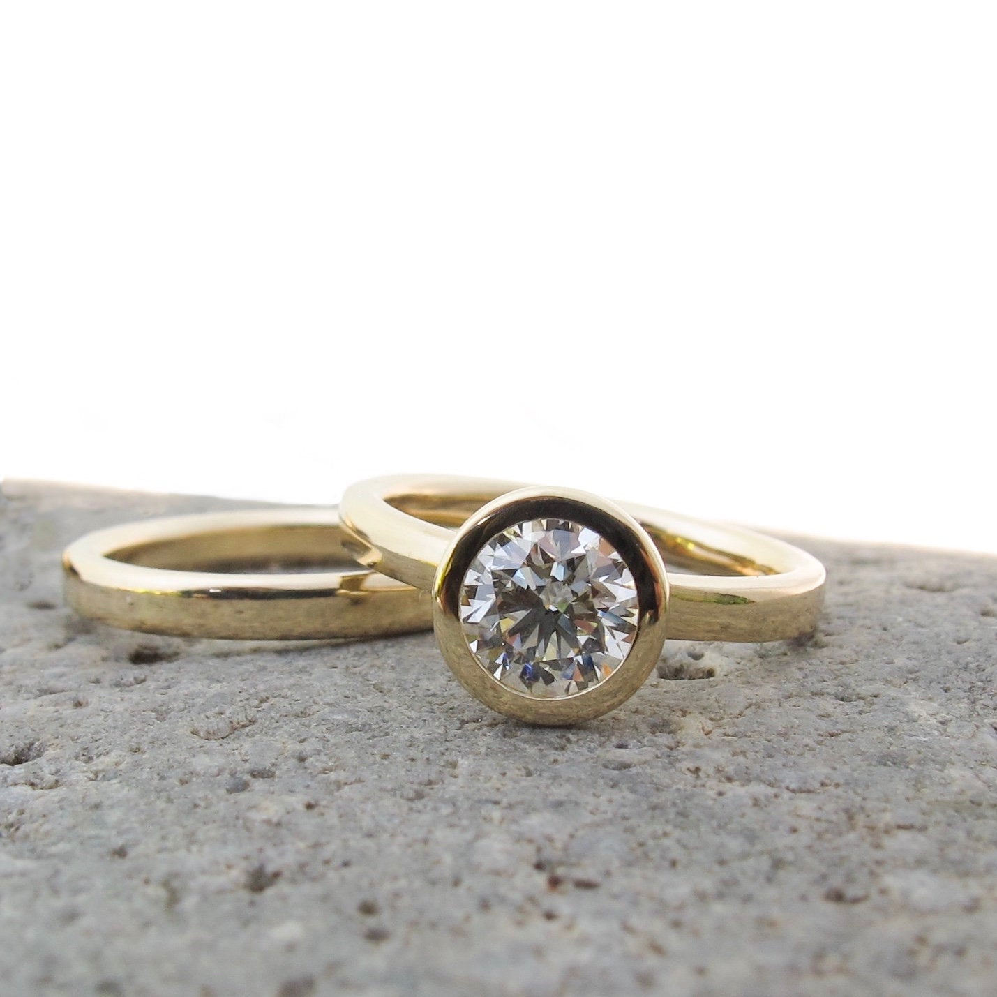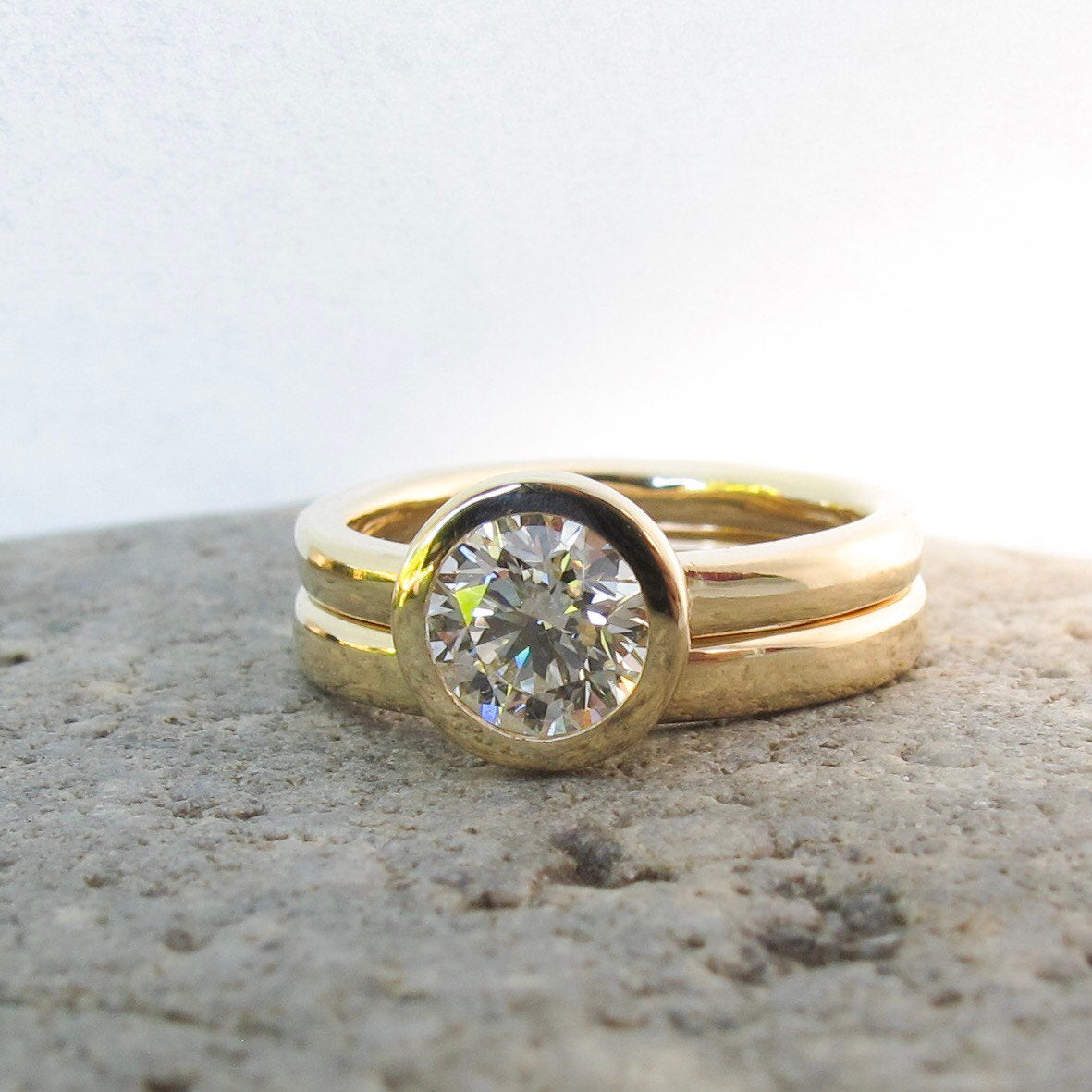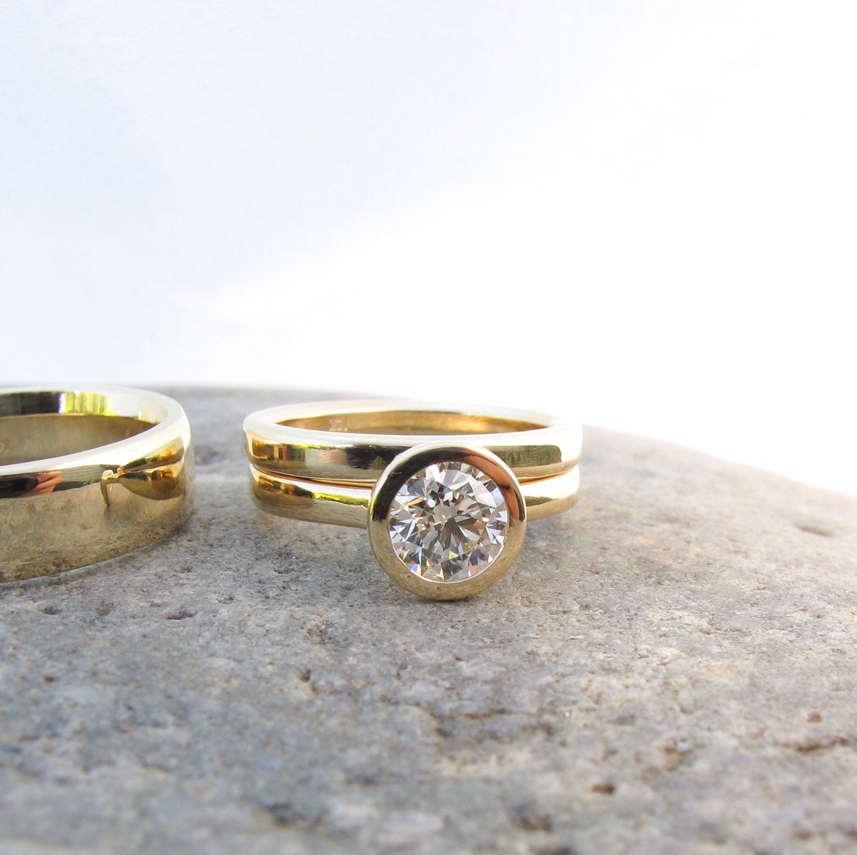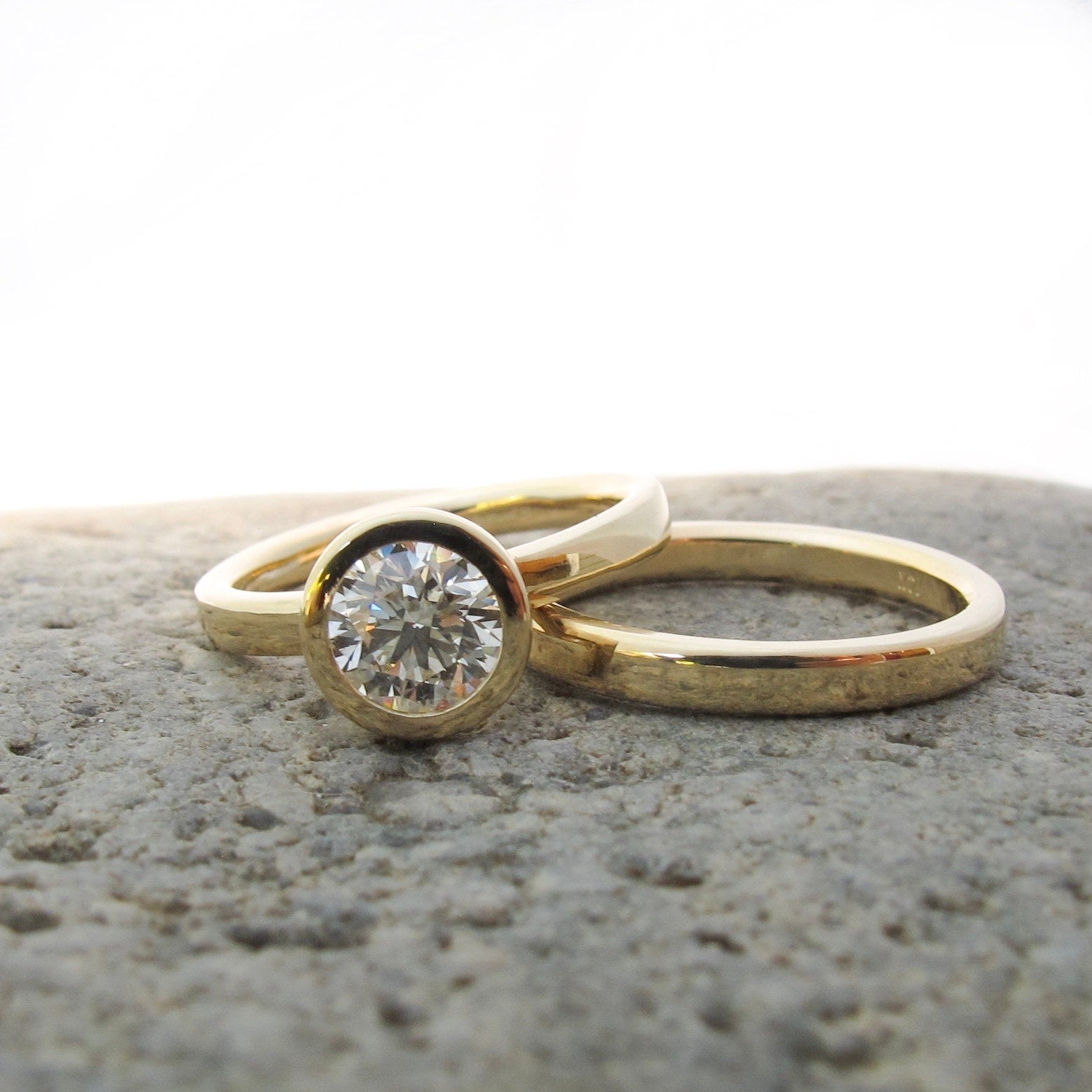 Classic 14kt gold and diamond bezel set engagement ring with two matching wedding bands. Traditional gold wedding bands with a low half round profile and a comfort inside. Beautifully smooth and comfortable. The diamond engagement ring has a low and elegant open bezel, sparkles from all sides!