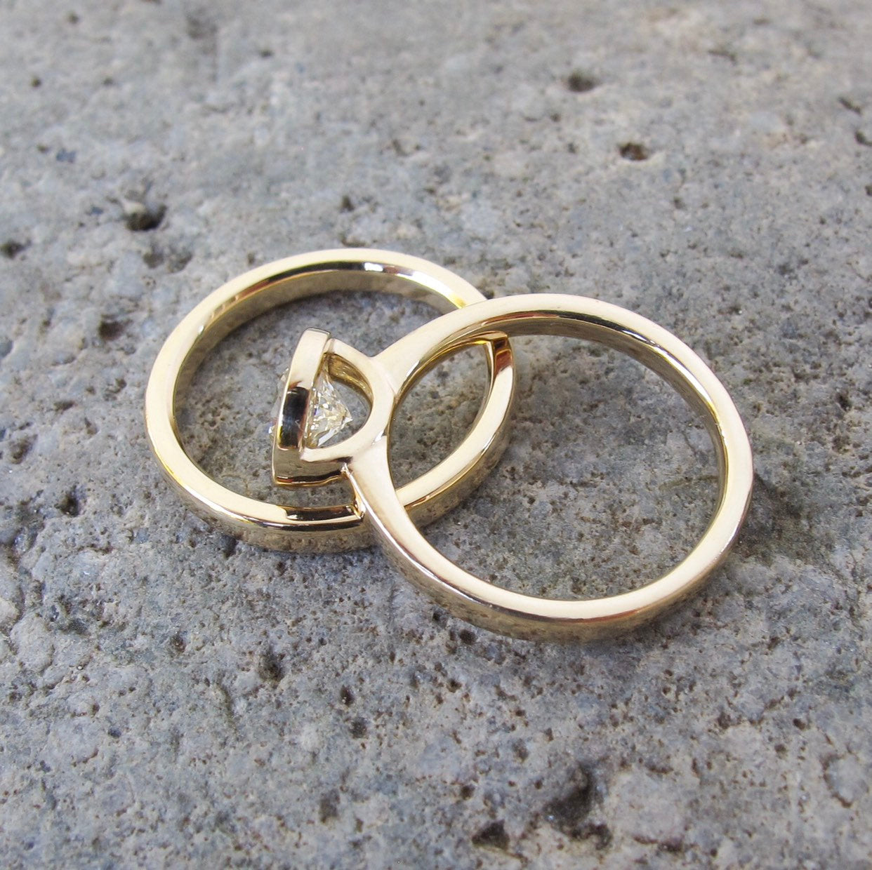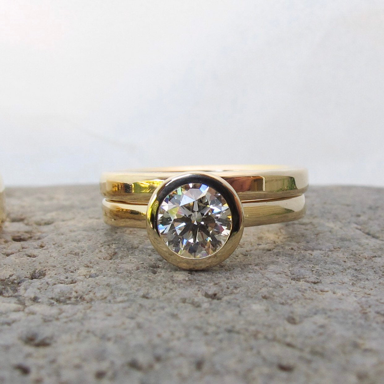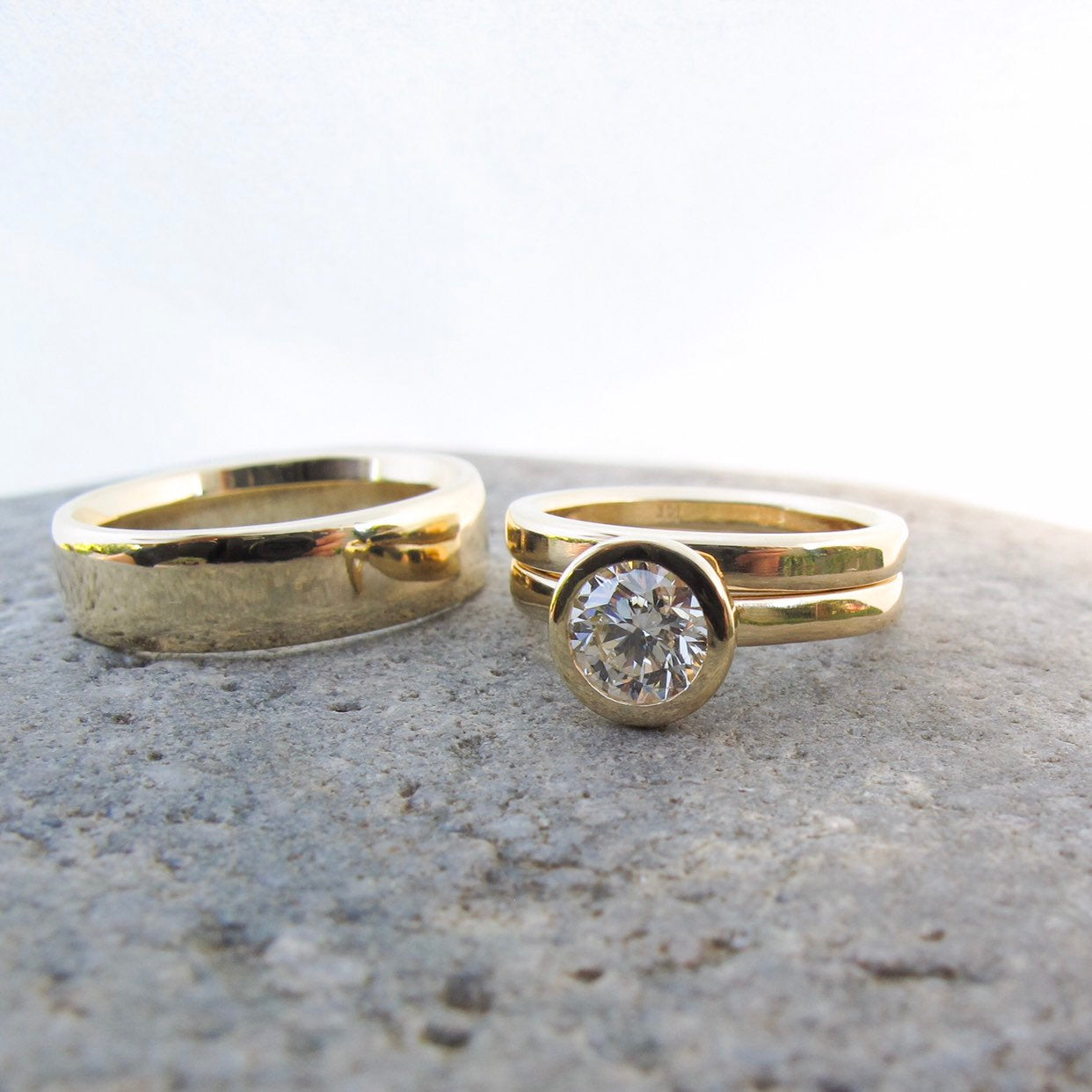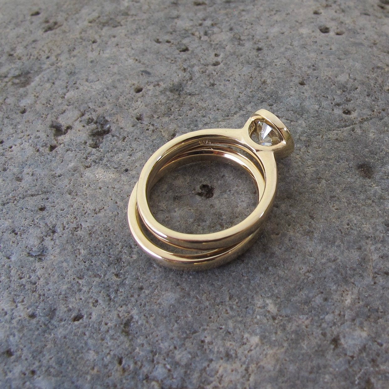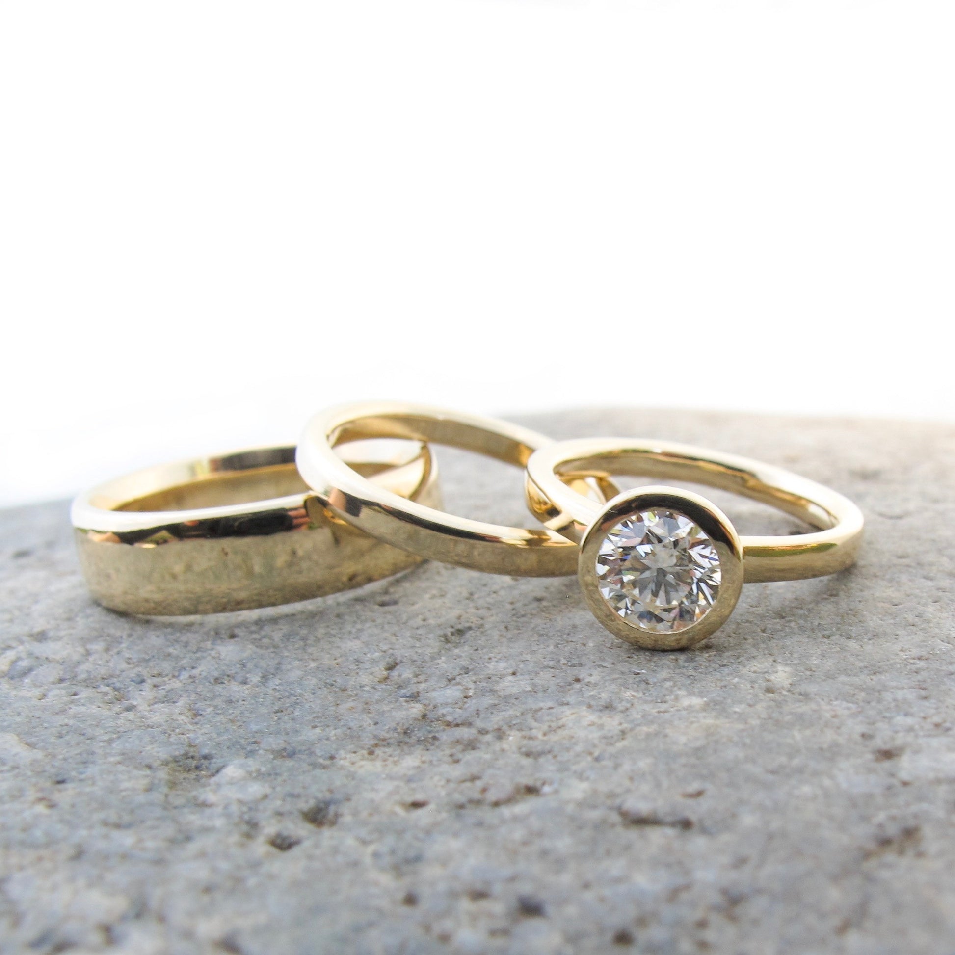 Classic gold and diamond bezel set engagement with gold wedding bands