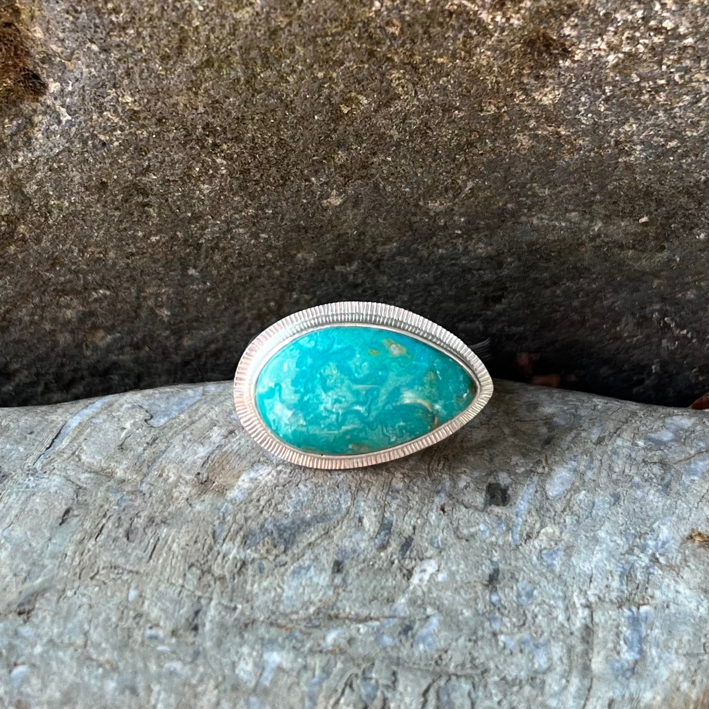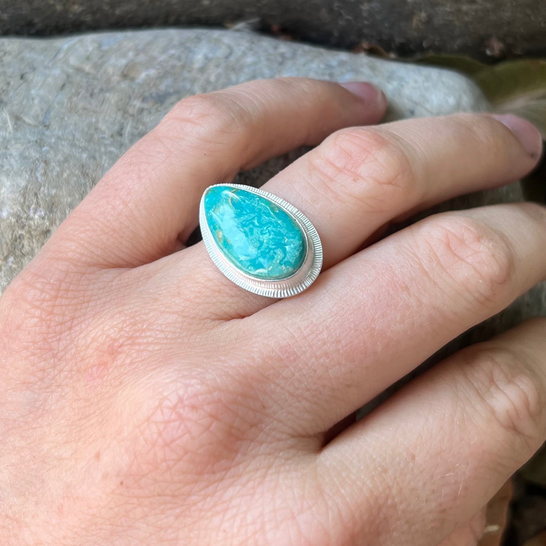 Pear shaped turquoise with a swirling teal and white matrix. Size 6. Sterling silver. Ships in 2-3 business days.