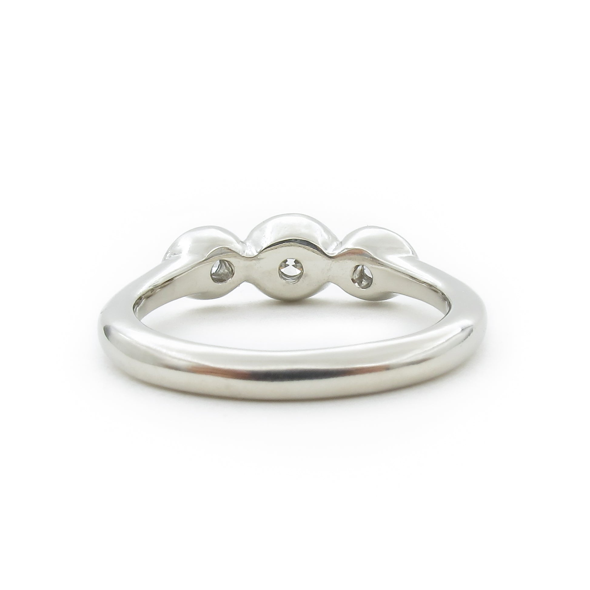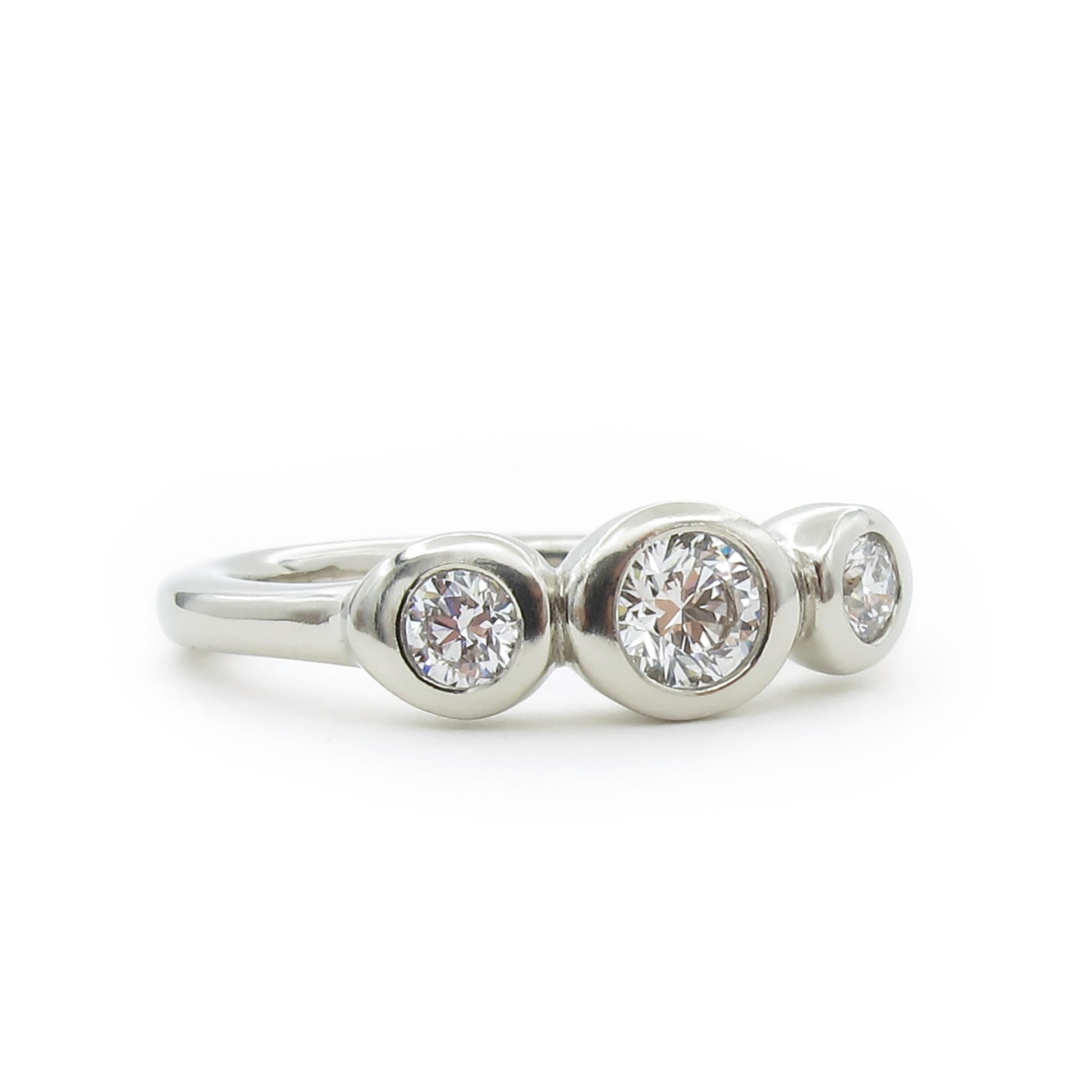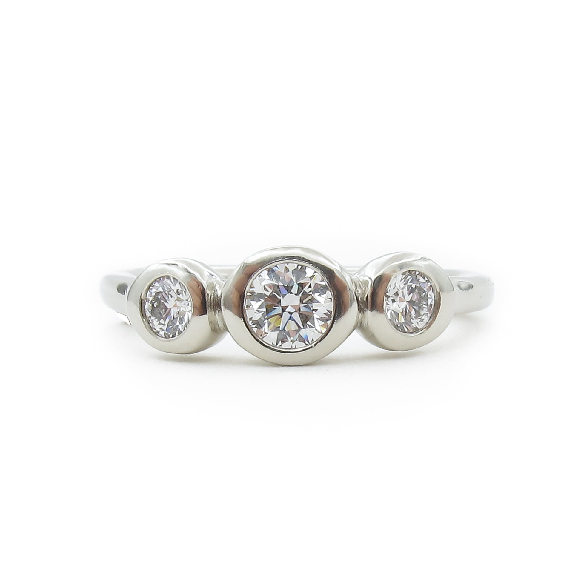 This is my favorite way to set stones by far. I love the subtlety, but also the solidity of the setting. 3 hand carved recycled white gold settings wrap tightly around 3 conflict free diamonds. The center diamond is a .25ct and the two side diamonds are 3mm each. Lovely stones, with lots of sparkle.