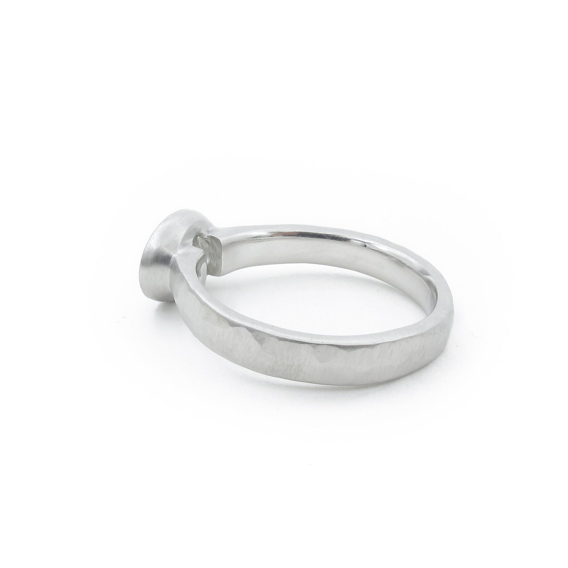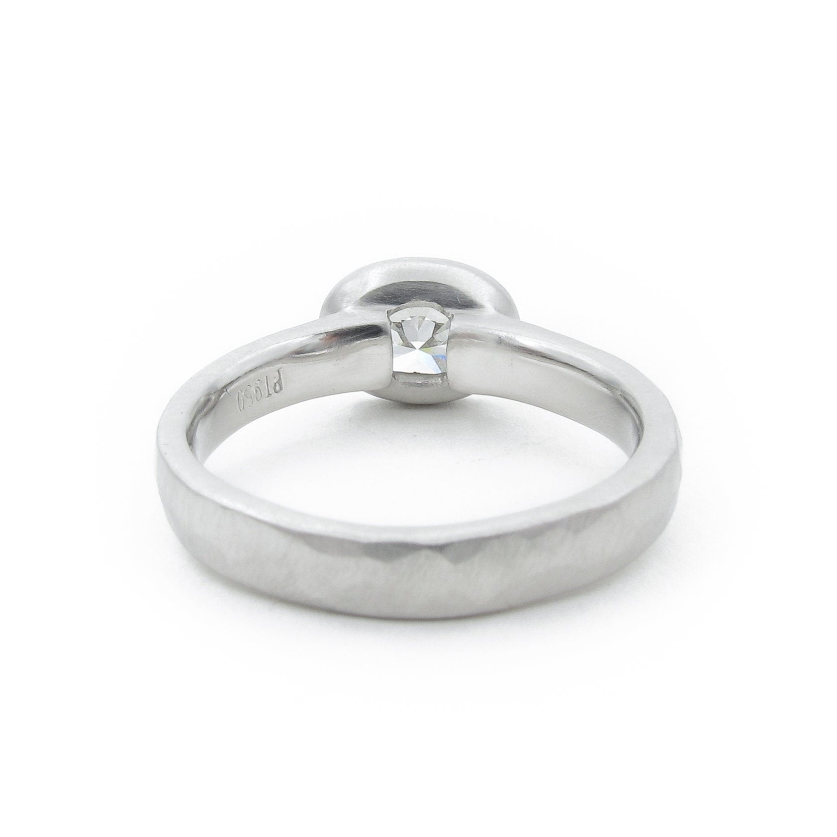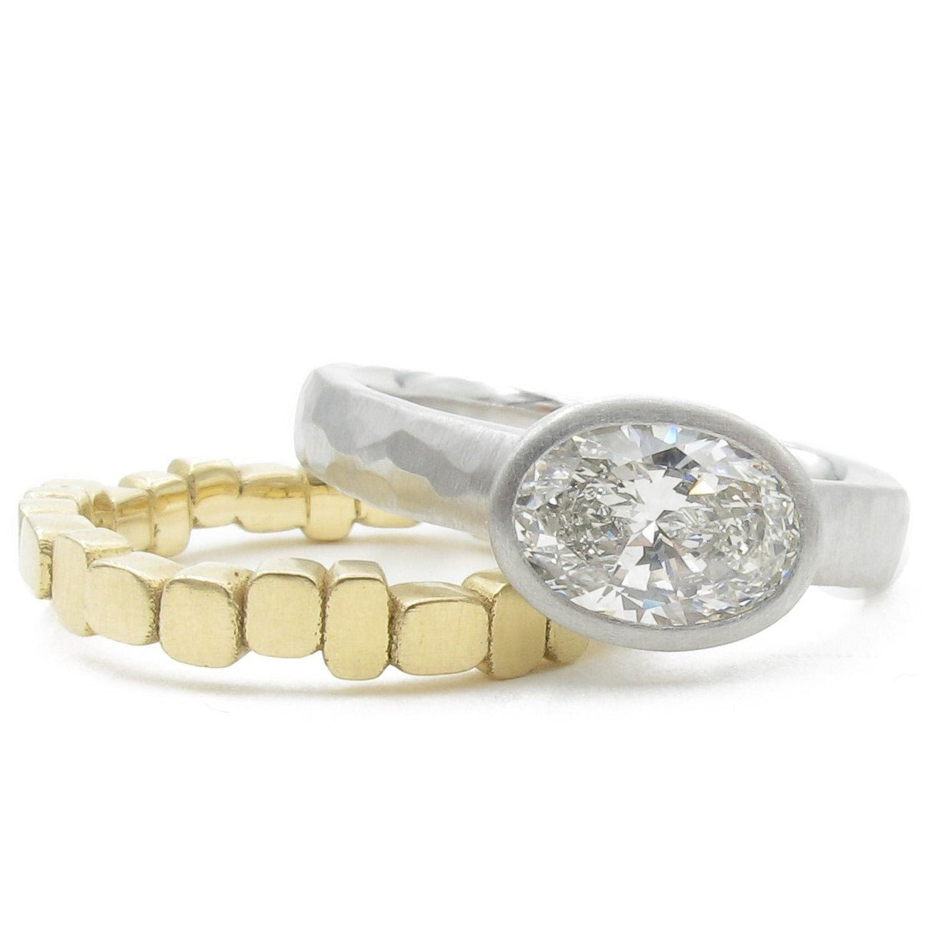 Solid platinum, 14kt, or 18kt gold bezel set semi-mount engagement ring with the setting placed east west.  A narrow, minimalist bezel will securely hold your oval cut stone.  Show here with a 1.30ct oval diamond. The band width is right around 4mm and has a hammered texture reminiscent of driftwood.  This is a solid and easy to wear style, with a comfort fit inner surface.  The entire ring has been given a satin matte finish.  This style of solitaire will stack flush with a wedding band.