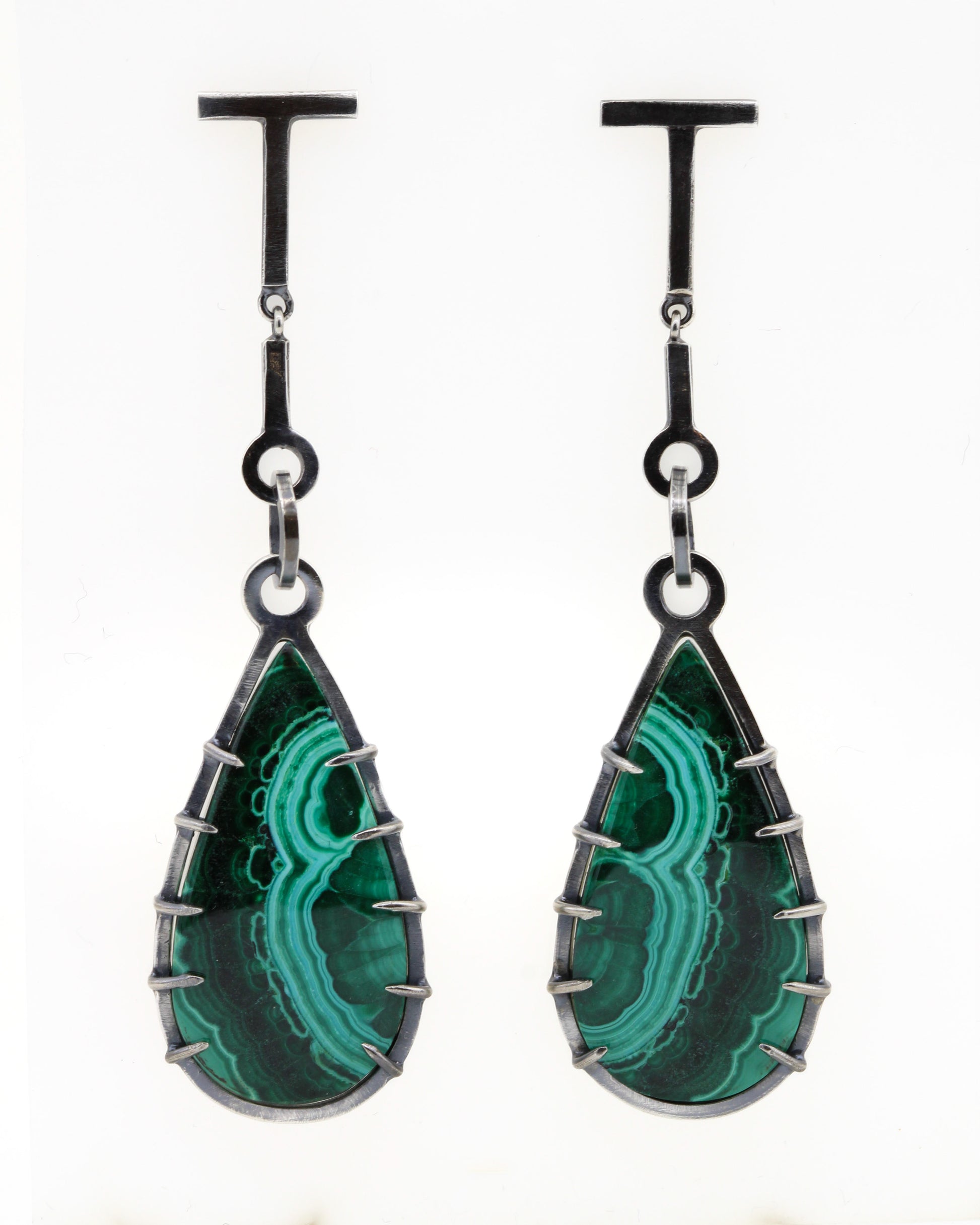 Statement drop earrings in oxidized sterling silver with chrysocolla malachite. Teardrop-shaped stones set in hand-cut geometric prongs. Triple oxidized silver links with T-bar posts. One-of-a-kind handmade earrings showcasing natural stone patterns. Just under 2.25 inches long. 3.8g each in weight.