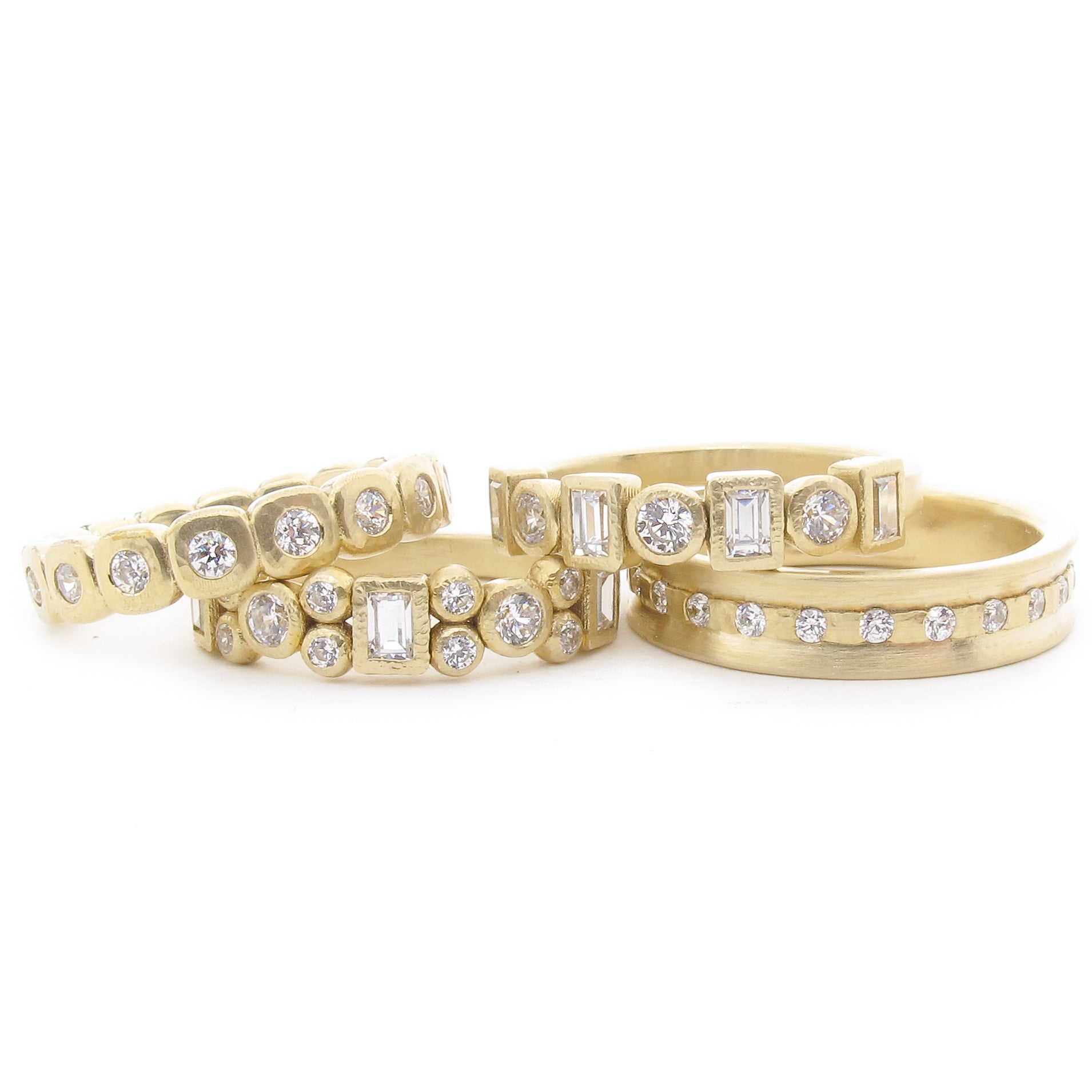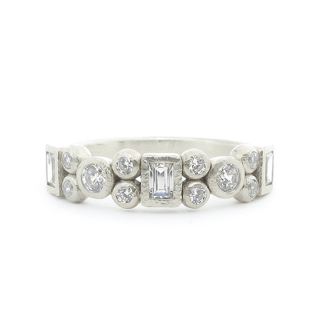 Alternating round and baguette diamonds in hand textured bezel settings. This ring has a solid feel, and comfortable flat profile solid shank on the palm side that is just over 2mm wide. Choose from a variety of 14 or 18kt golds or 950 platinum. Wear it alone or pair it with a solitaire for a lovely wedding set. It would also look great stacked with a plain band as an alternative engagement ring. Approximately .50ctw.