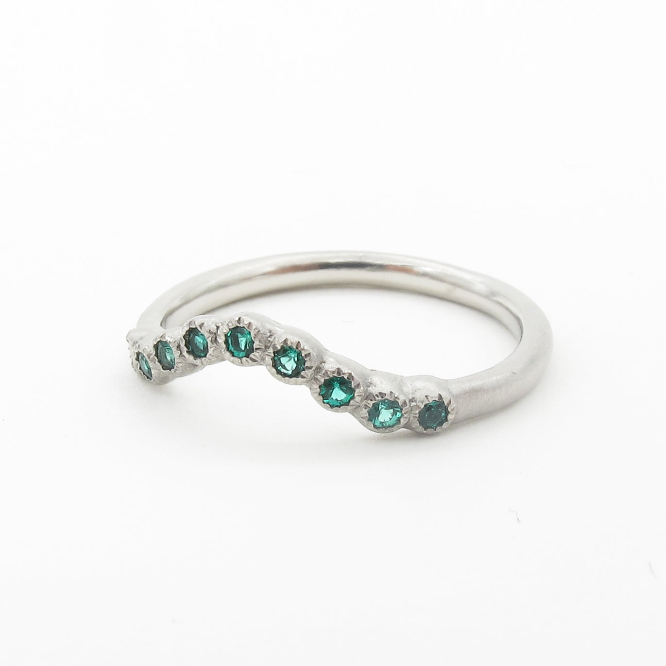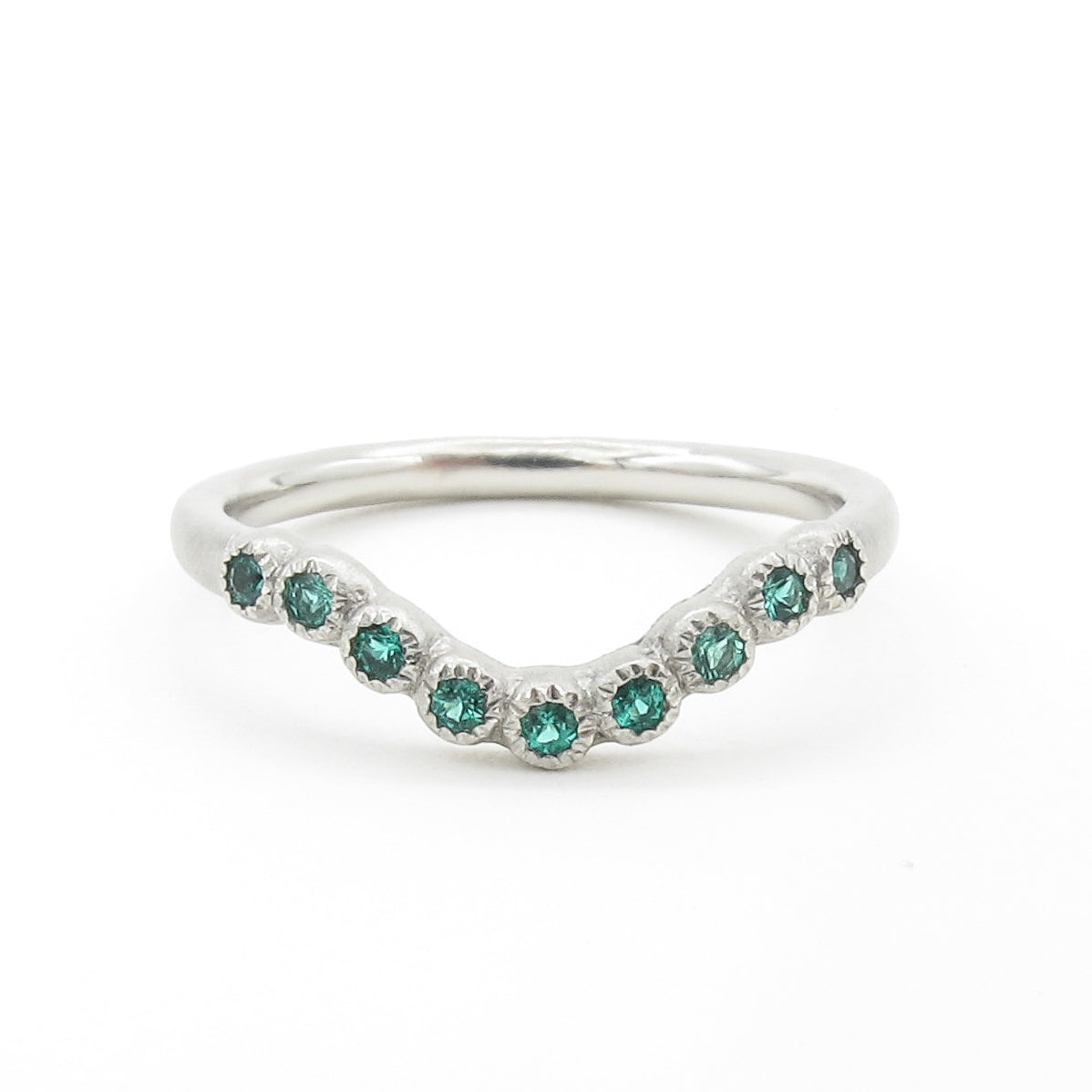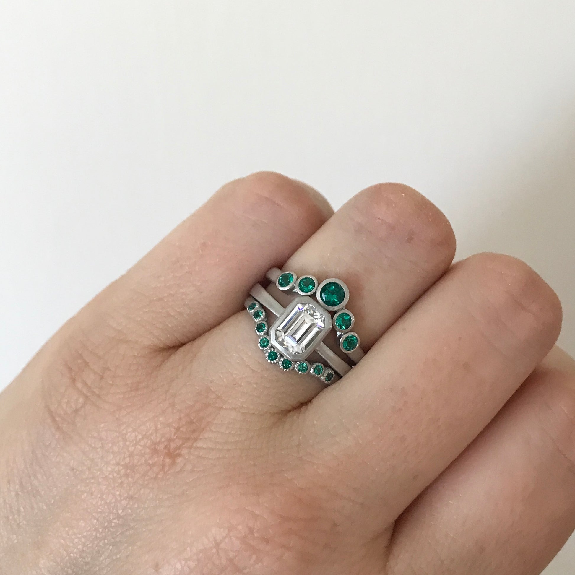 Classic emerald green stones are bezel set in graceful peaks to frame your engagement ring in additional sparkles. I love these bands paired with a white center stone.