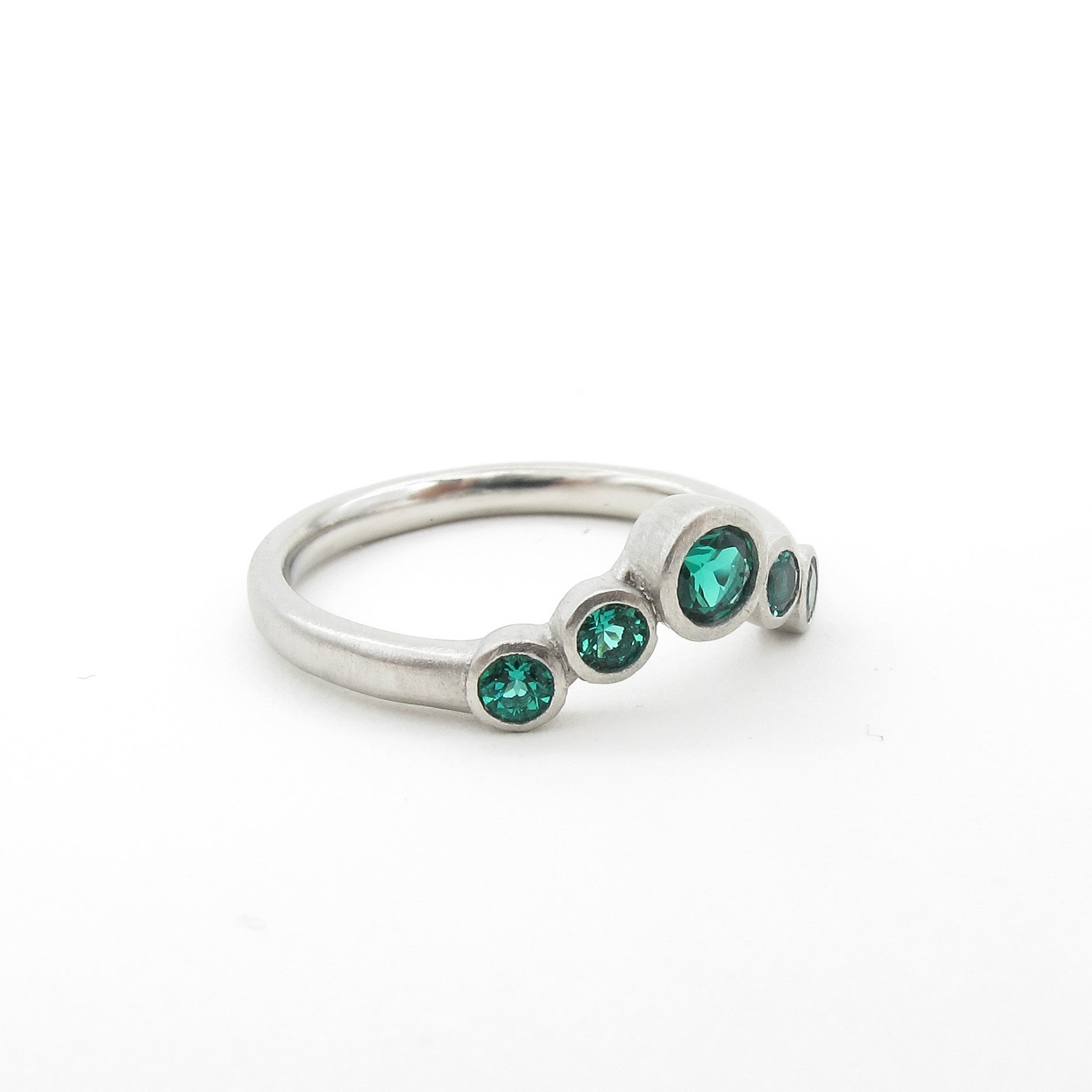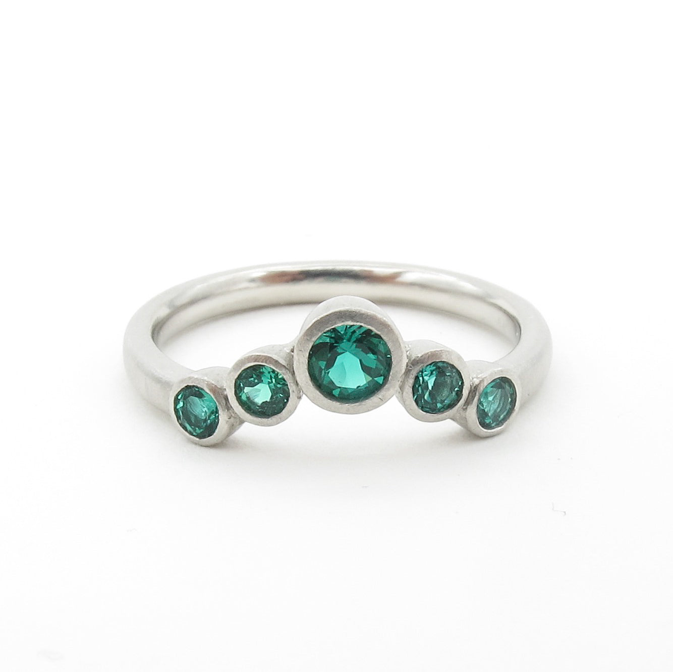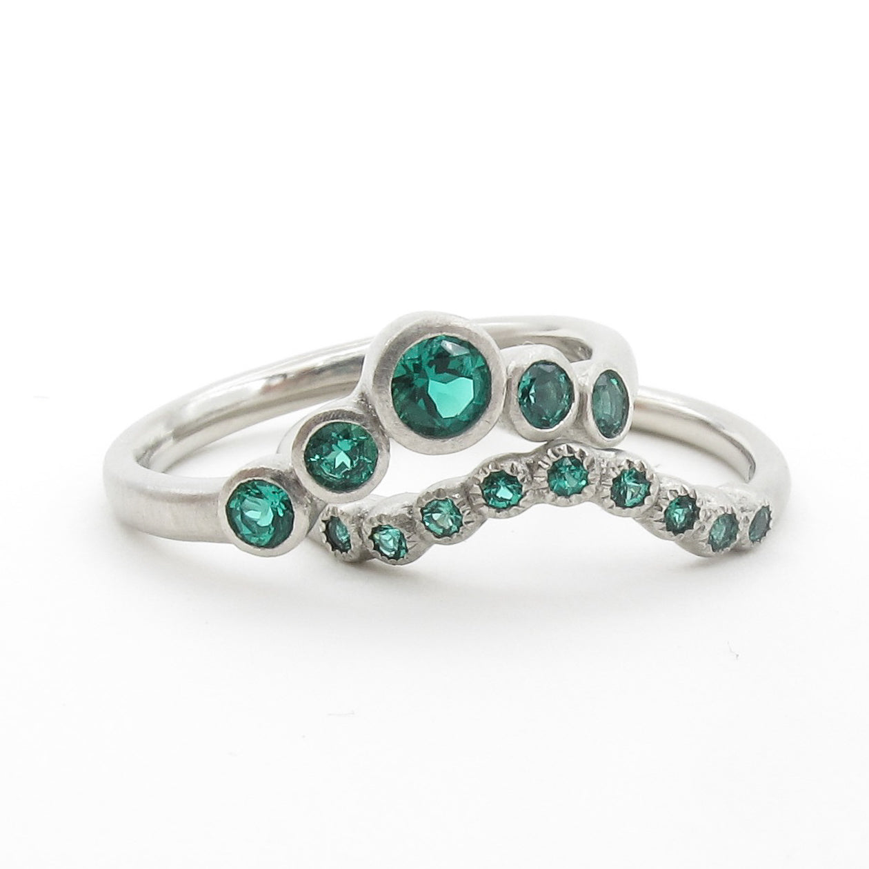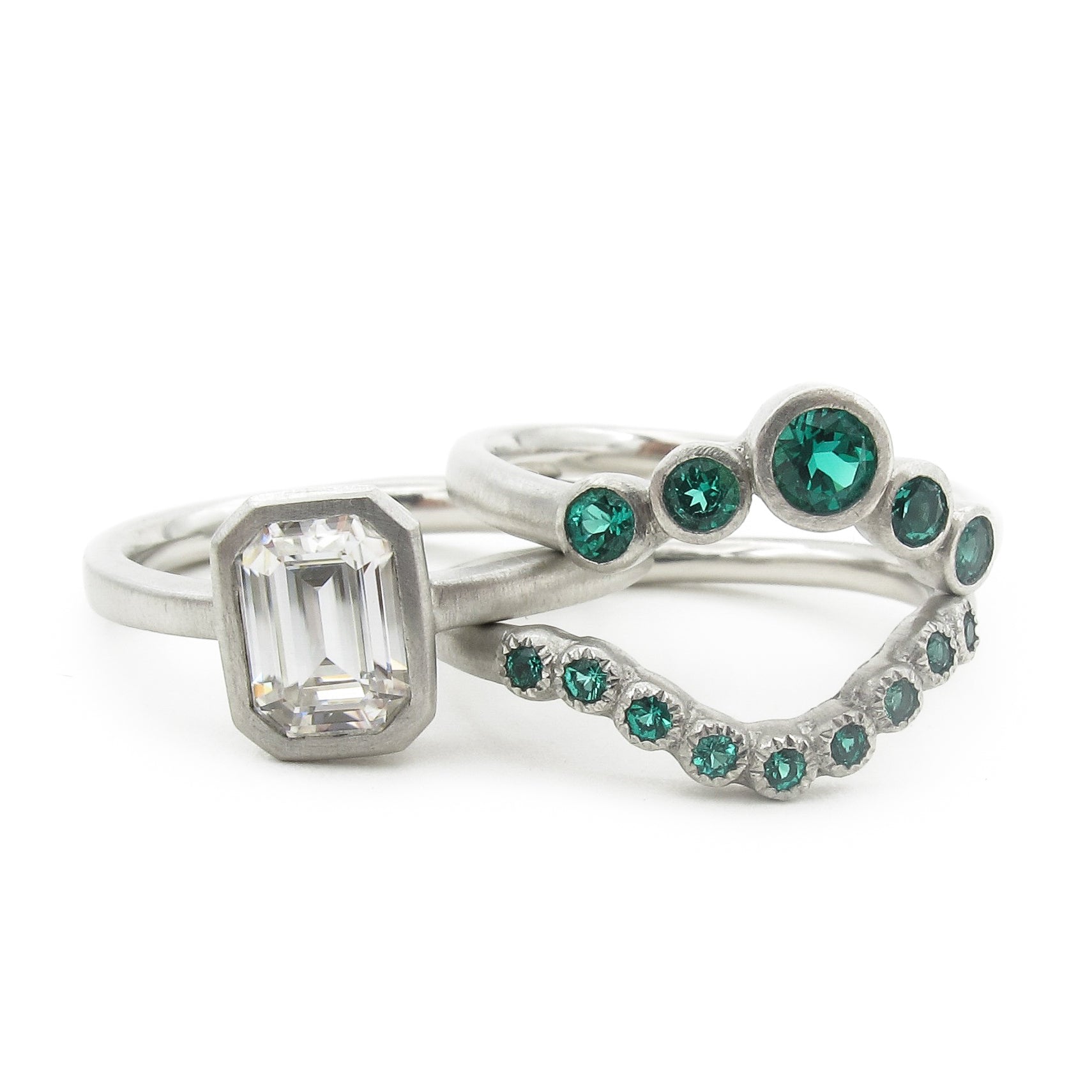 Classic emerald green stones are bezel set in graceful peaks to frame your engagement ring in additional sparkles. I love these bands paired with a white center stone.