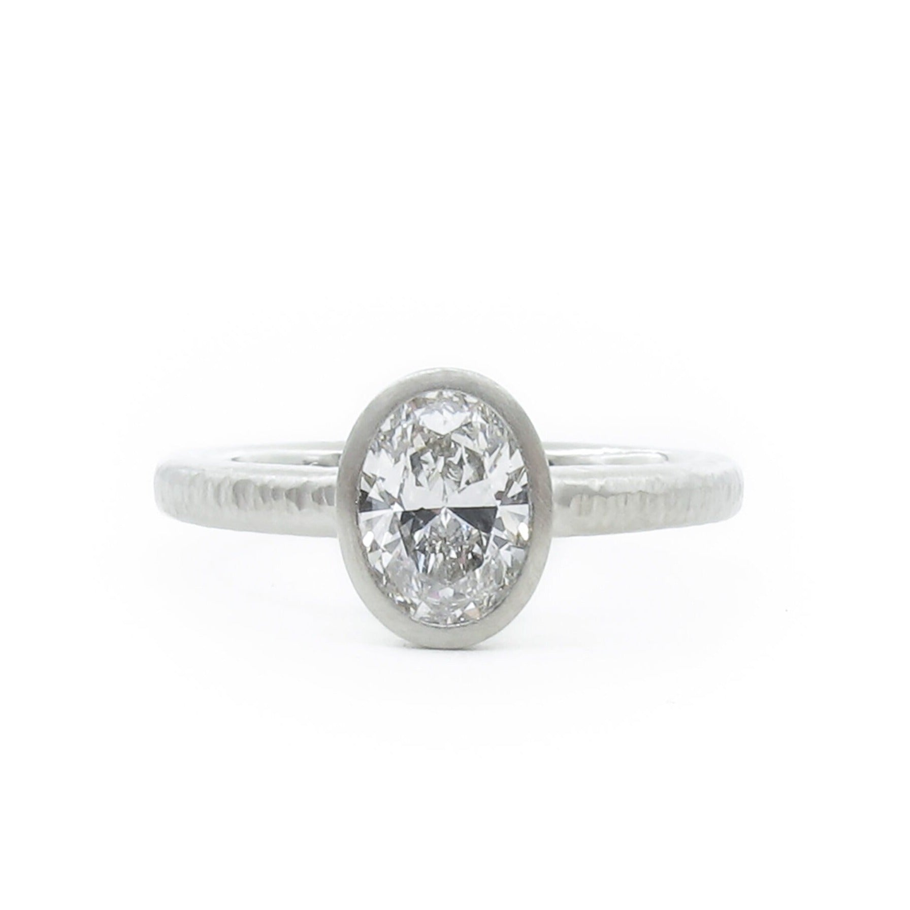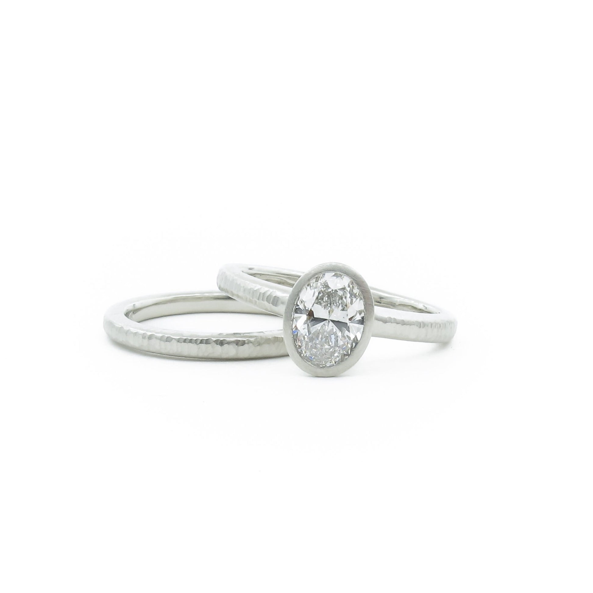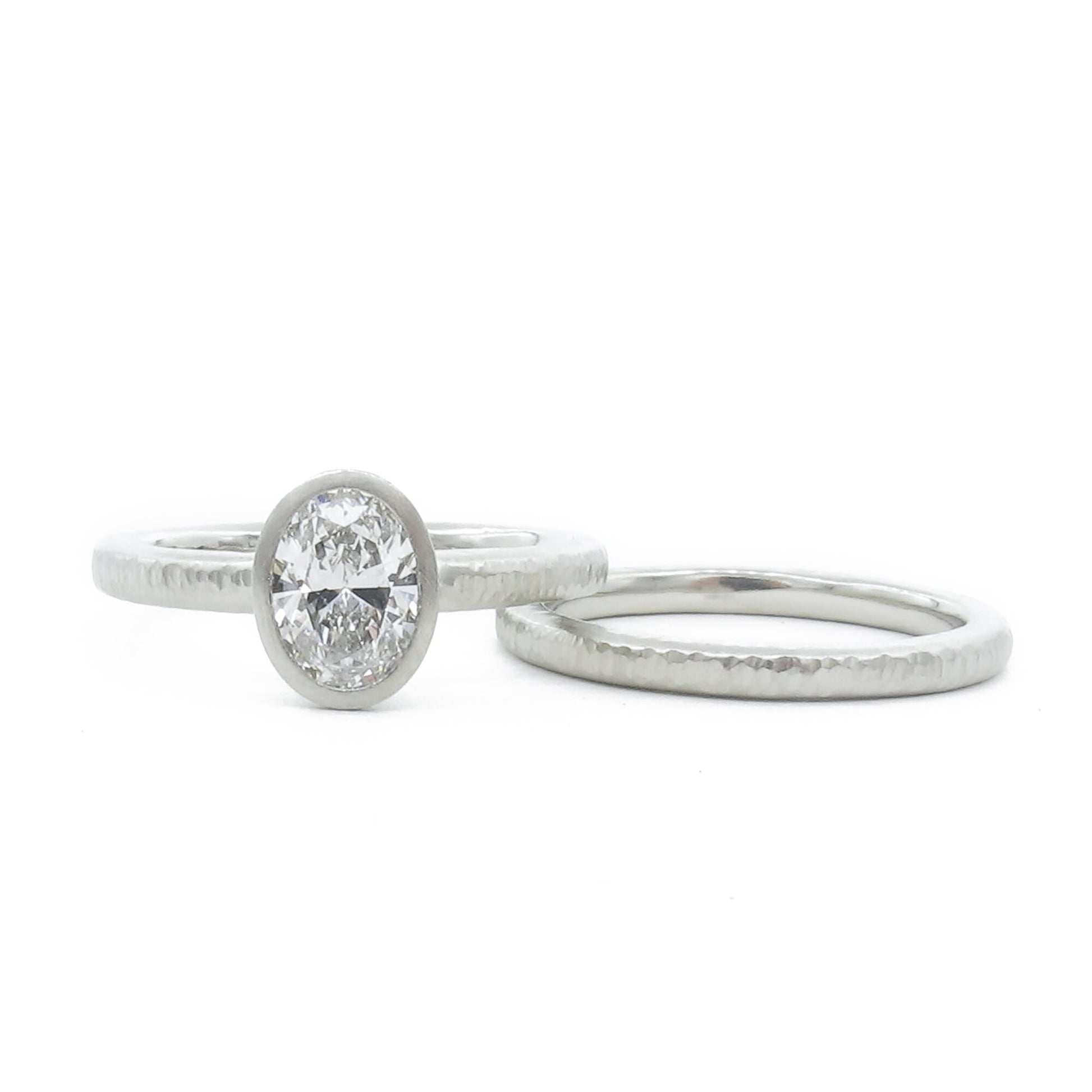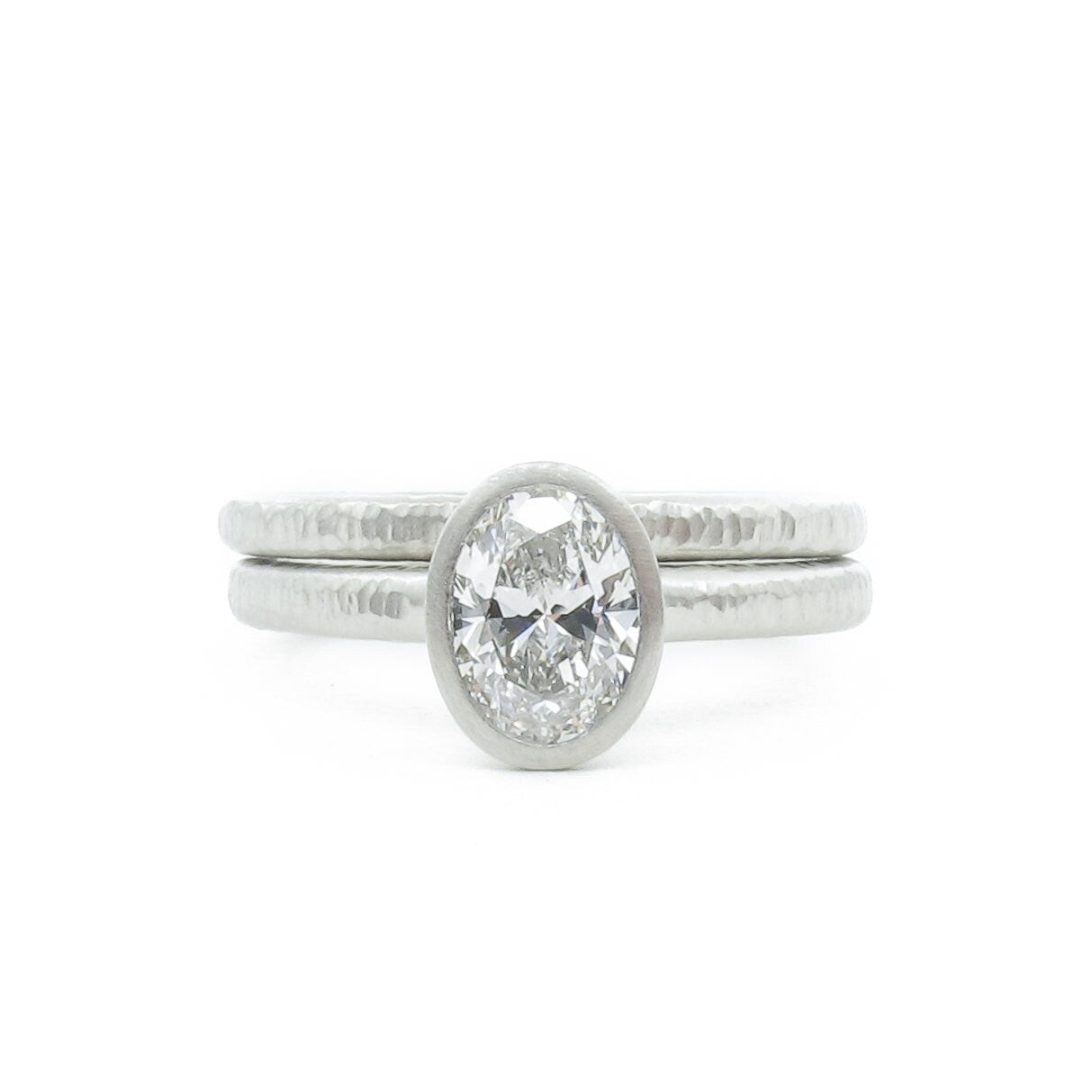 Narrow, delicate bezel surrounds a gorgeous colorless oval diamond. Smooth and wearable, nothing to snag or catch on clothing. The band widths are both 2mm and have a light organic hammer cut texture and a satin matte finish.
