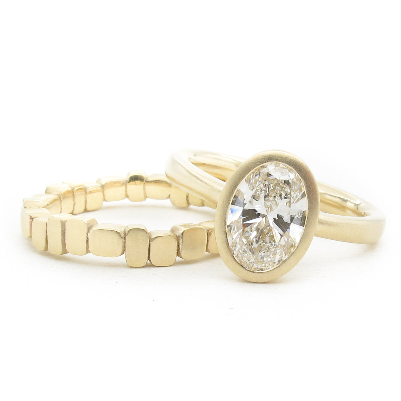 Modern oval engagement ring setting. Full bezel setting around an oval shaped stone. Low profile and super wearable.  The band is elegantly tapered towards the setting and widens to around 3mm wide on the palm side.  Rounded profile with a comfort fit.  Shown here with the Tumbling Blocks ring, available separately.  The diamond pictured is right around 1.3 carats, approximately 9.5mm by 6.5mm.