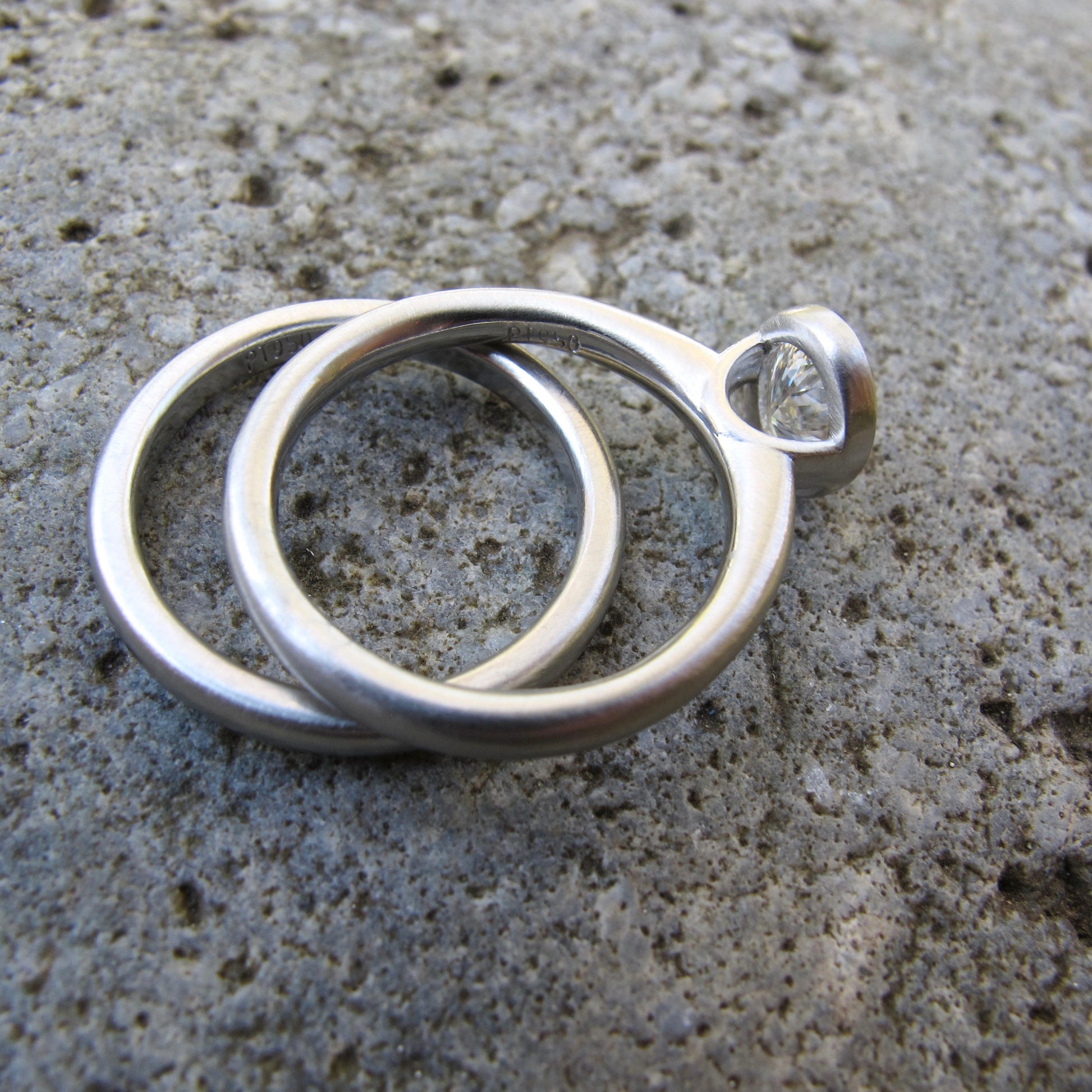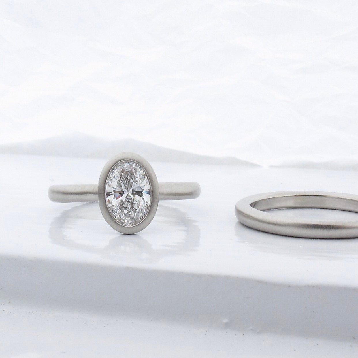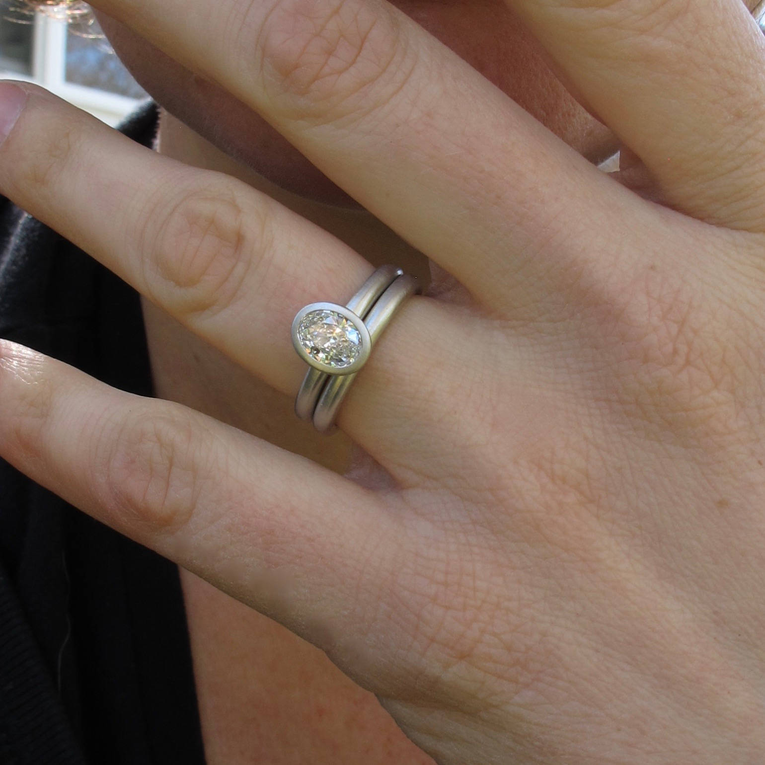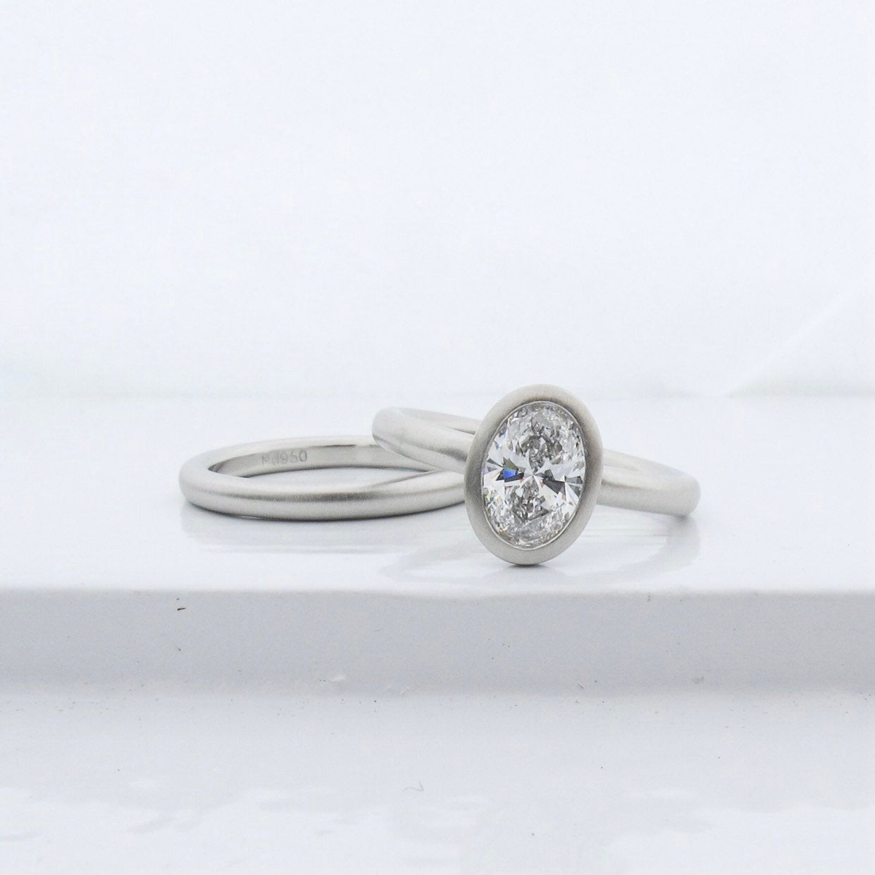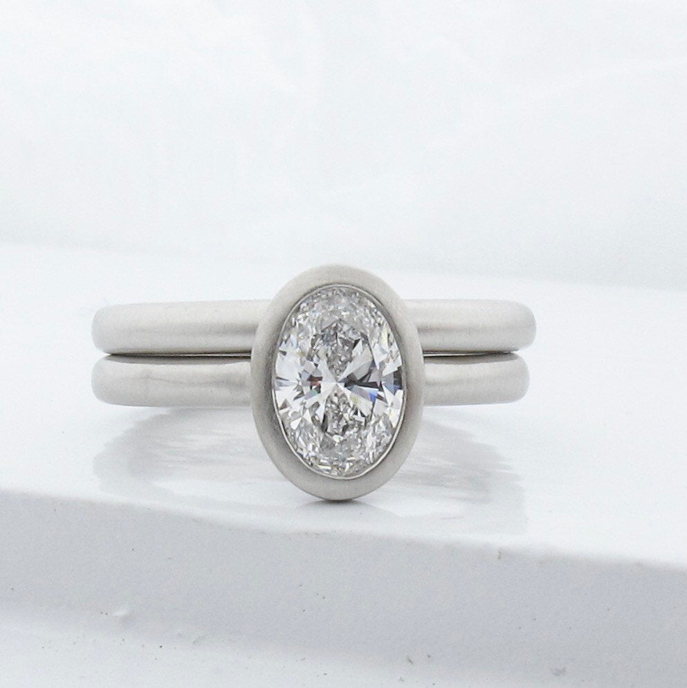 Pure white 950 platinum semi-mount with a graceful open bezel design. Paired with a rounded comfort fit wedding band that stacks comfortably flush with the engagement ring. Smooth satin matte finish. Custom made to fit your existing stone in an oval, round, or cushion shape. This setting would work best for stones between .25ct-2.5ct.
