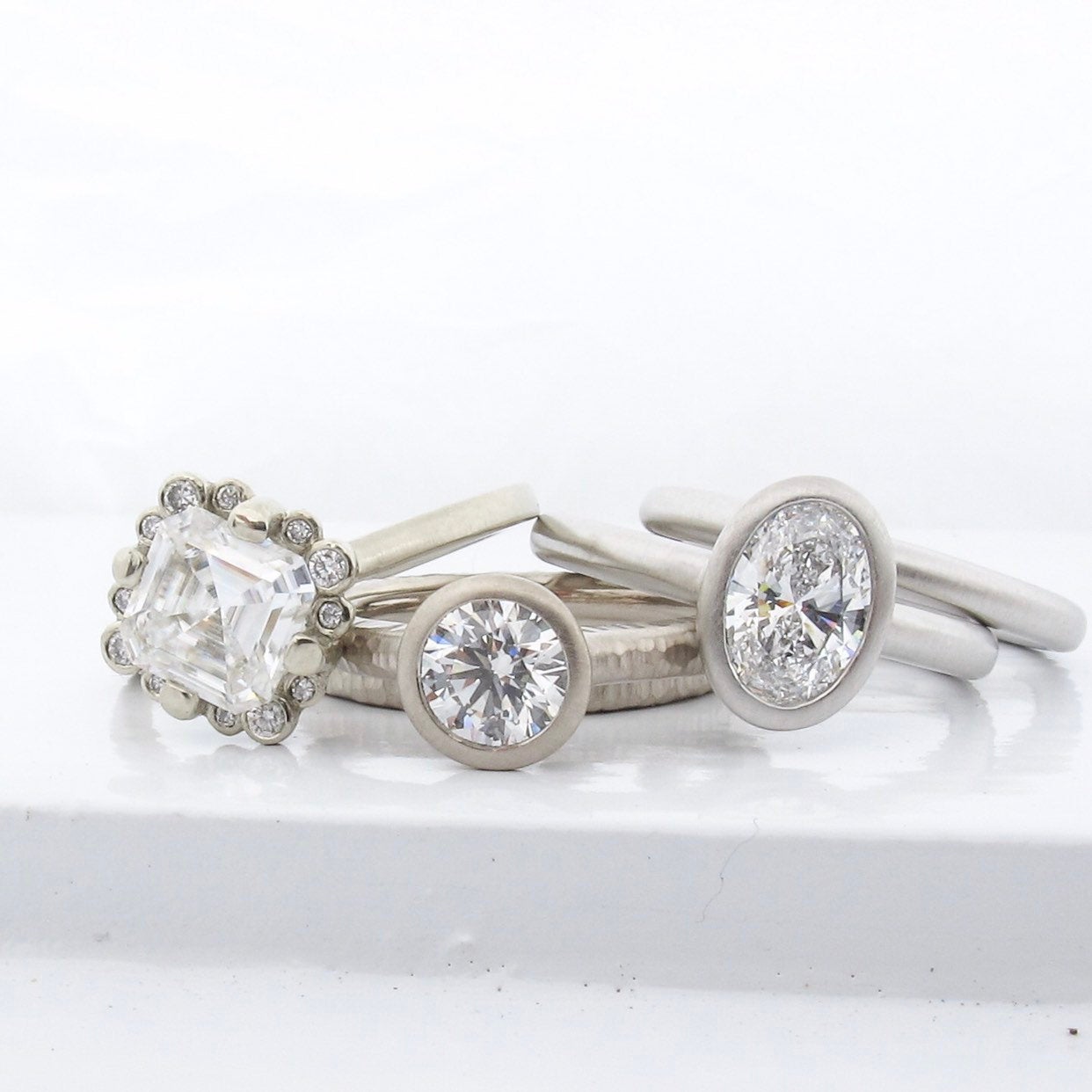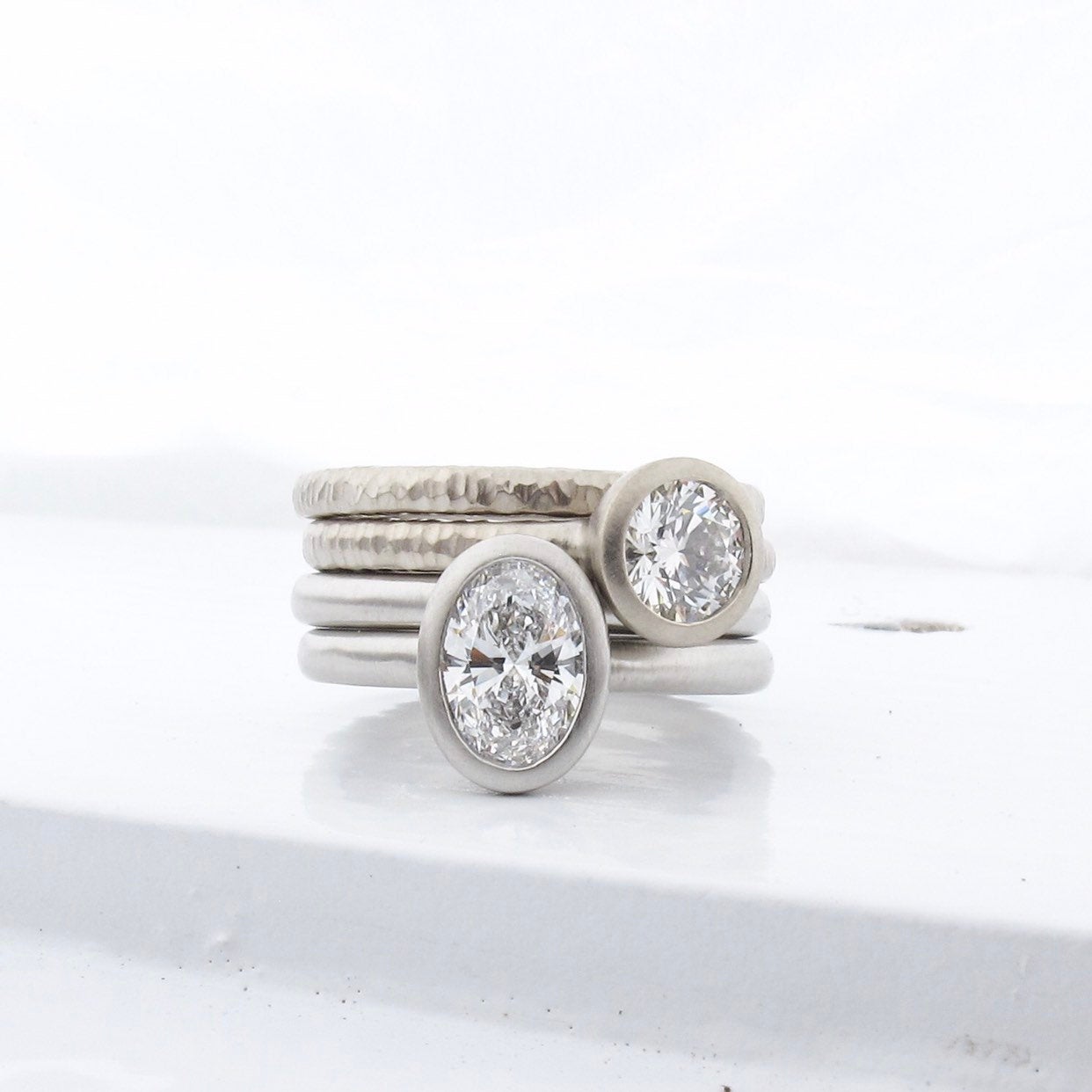 This engagement ring has a minimal bezel setting, with an open peekaboo construction. Band is approx. 2.5mm wide, rounded and smooth. Hammered textures are available. Satin matte finish (pictured), or high polish.