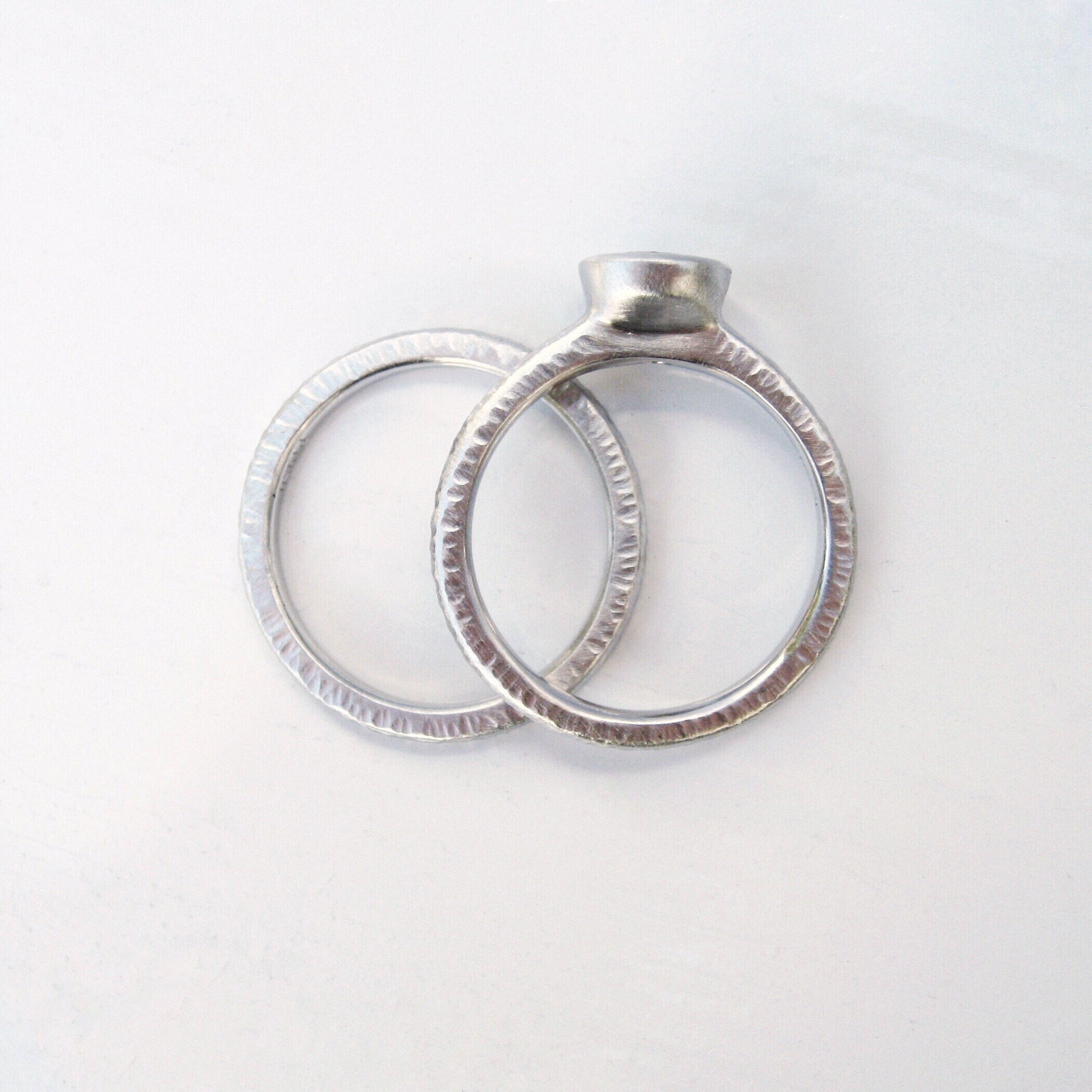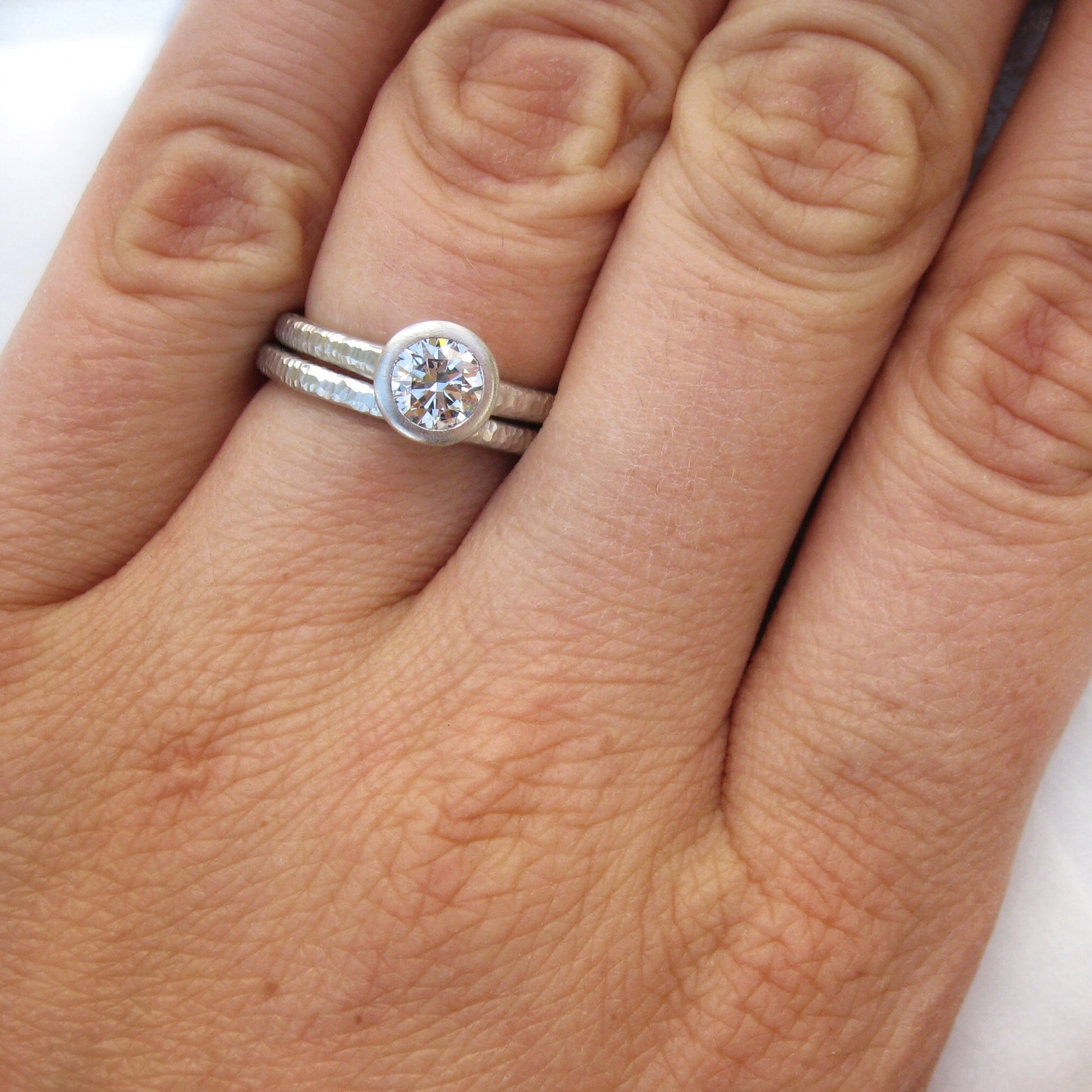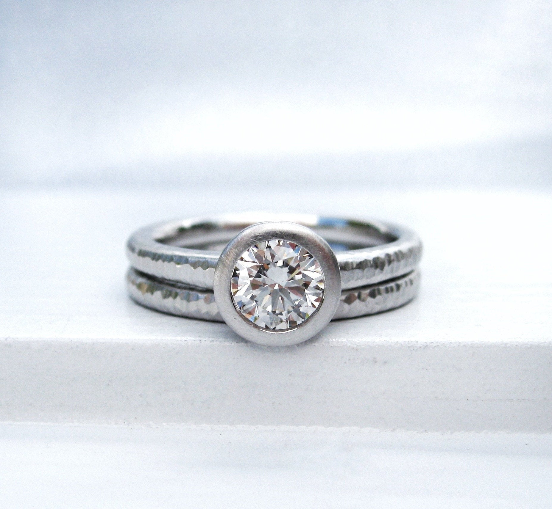 Modern rustic style diamond engagement ring and matching stacking wedding band in brilliant white 950 platinum. Featuring a sparkling .60ct GIA certified diamond. The bands are narrow and have a unique hammer-cut texture. Low profile for great wearability. The matching wedding band stacks perfectly flush for comfort.