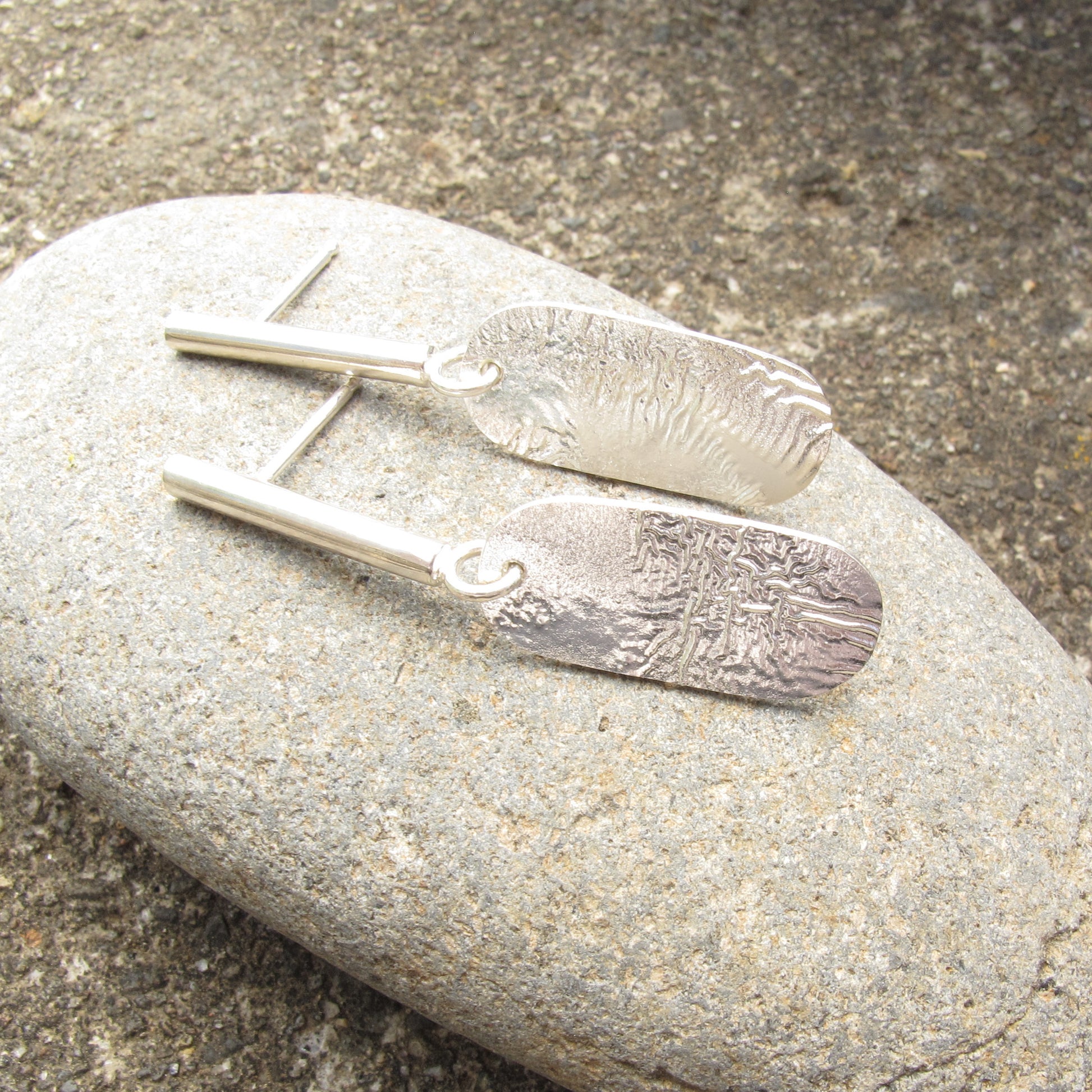 Sterling silver post style earrings with fluttering reticulated silver charms. Total length of 1.7 inch. Comes with both sterling butterfly style and silicone backs.