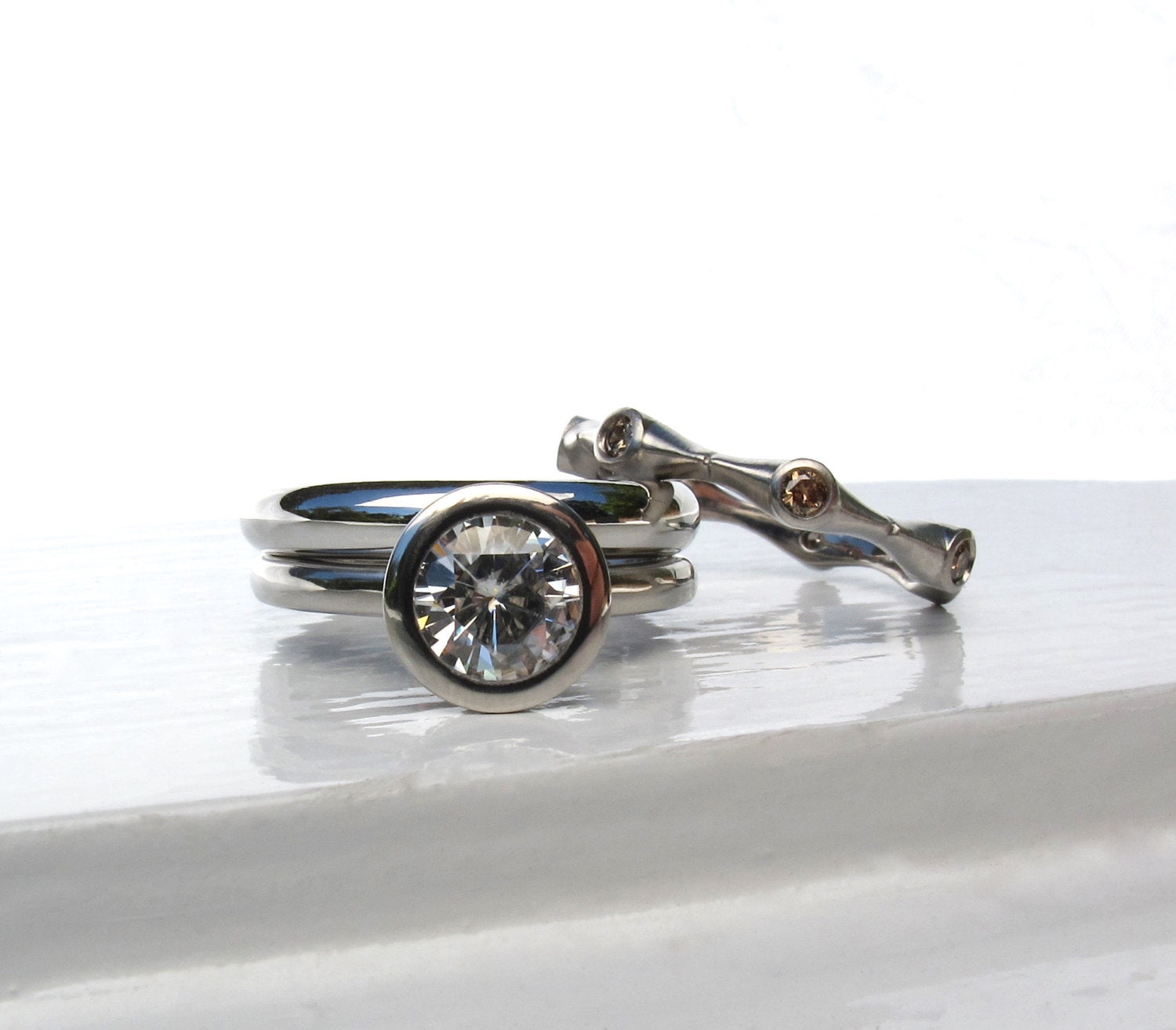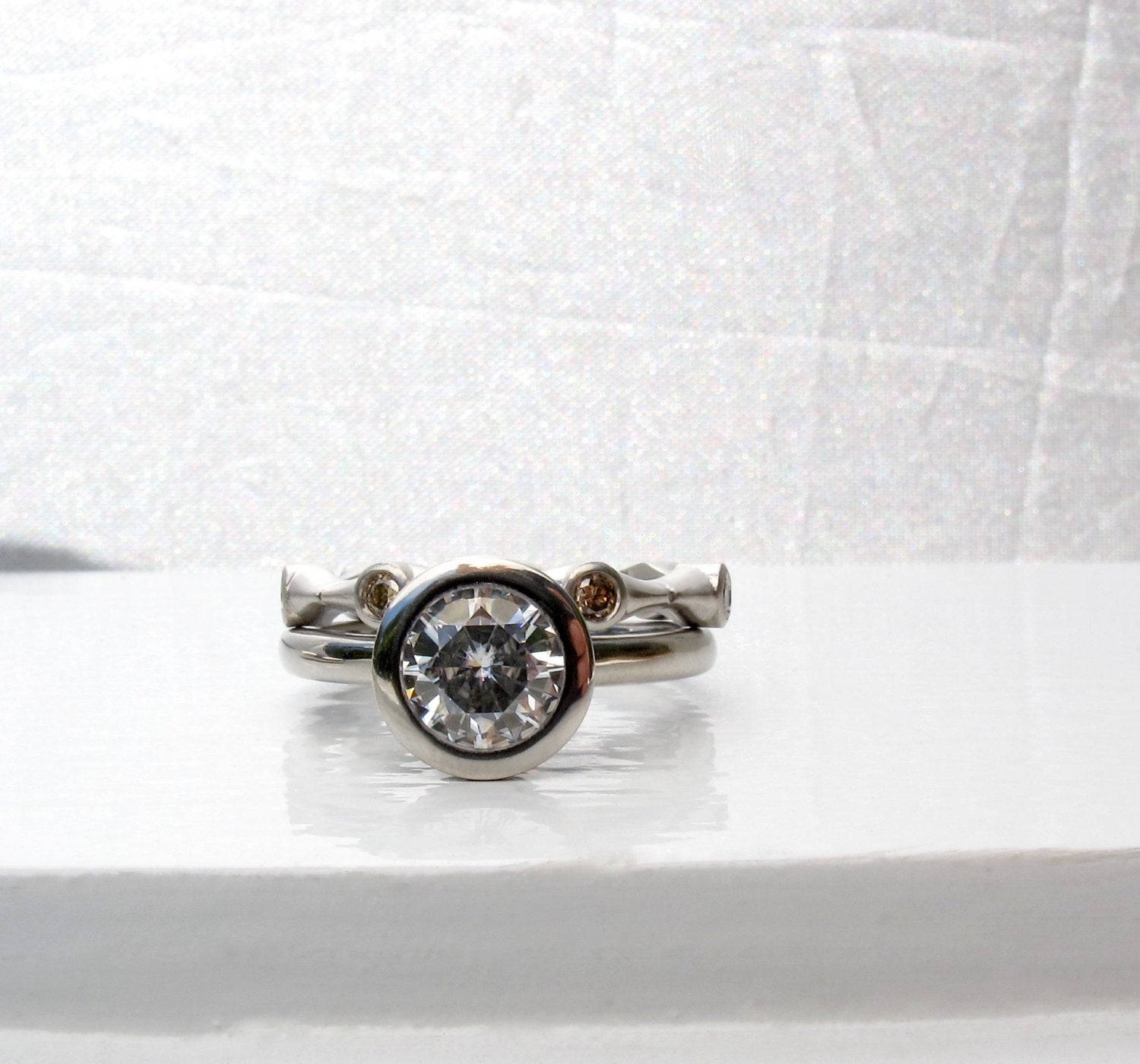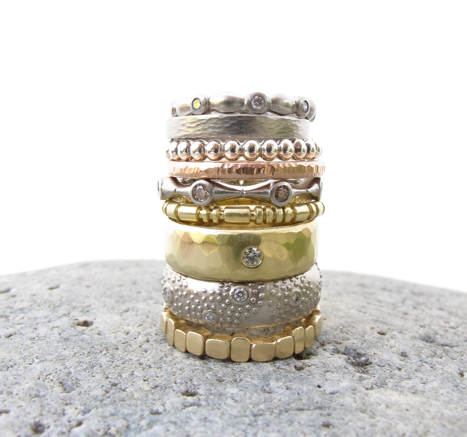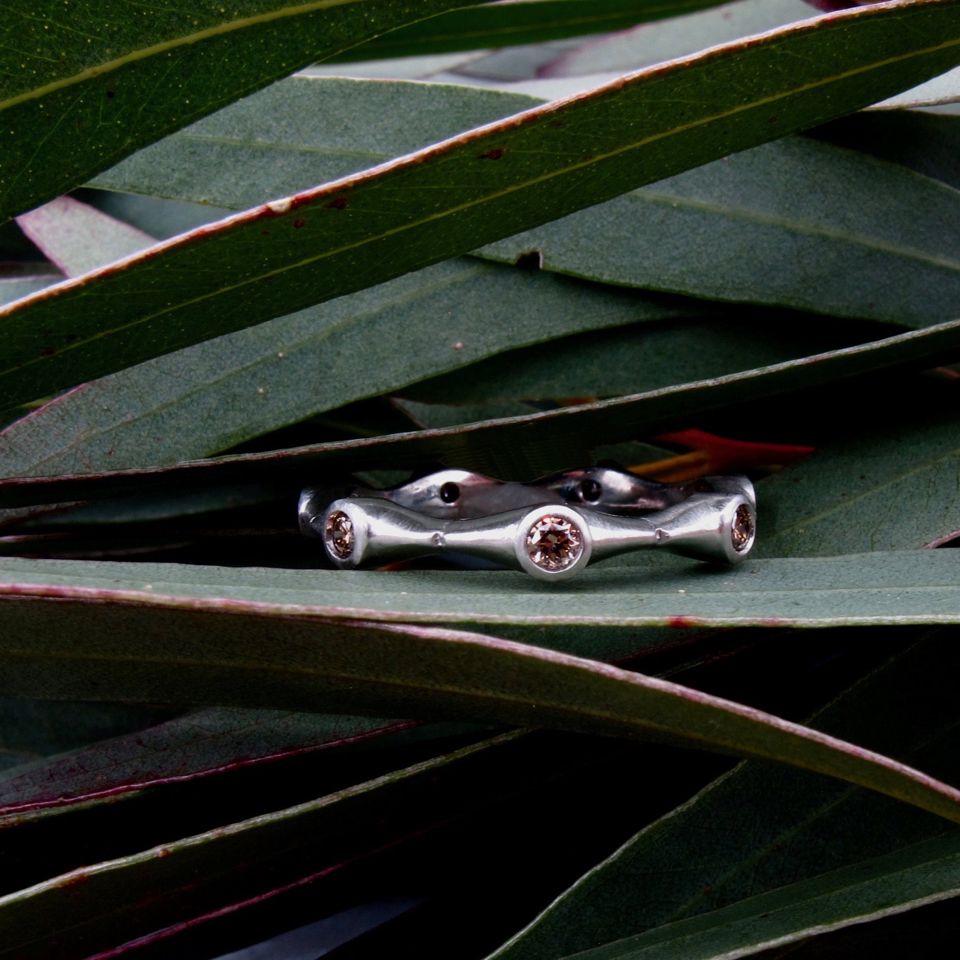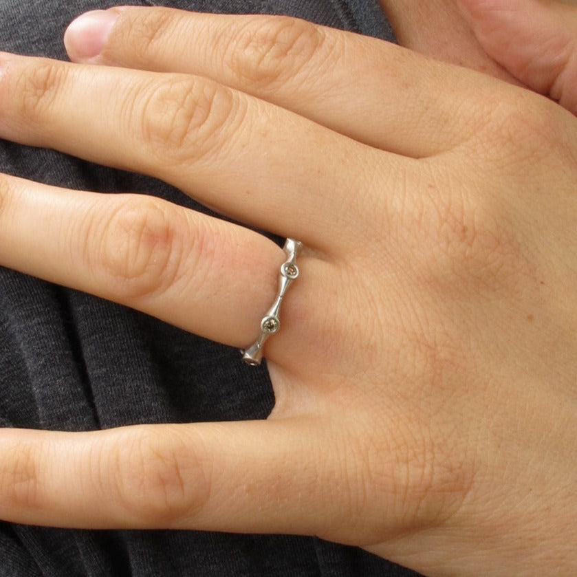 A unique stackable eternity ring featuring seven 2mm warm and sparkling cognac diamonds. The hand formed settings are spaced evenly around the band and the entire ring is given a soft satin matte finish. This band pairs beautifully with most of my solitaires. I also like it alone, paired with a plain band, or stacked in multiples.