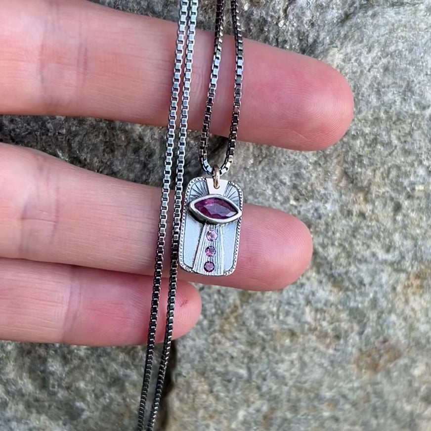 - Marquise cut pink sapphire set in sterling silver. Three pink tourmaline stones. 14kt gold accent and bale. 18 inch oxidized sterling silver box chain.