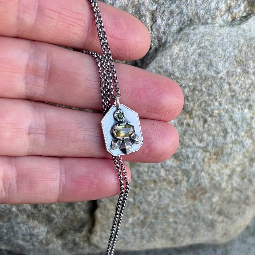 - Golden yellow oval sapphire set in sterling silver, green tourmaline accent stone. 18 inch oxidized sterling silver rolo chain.