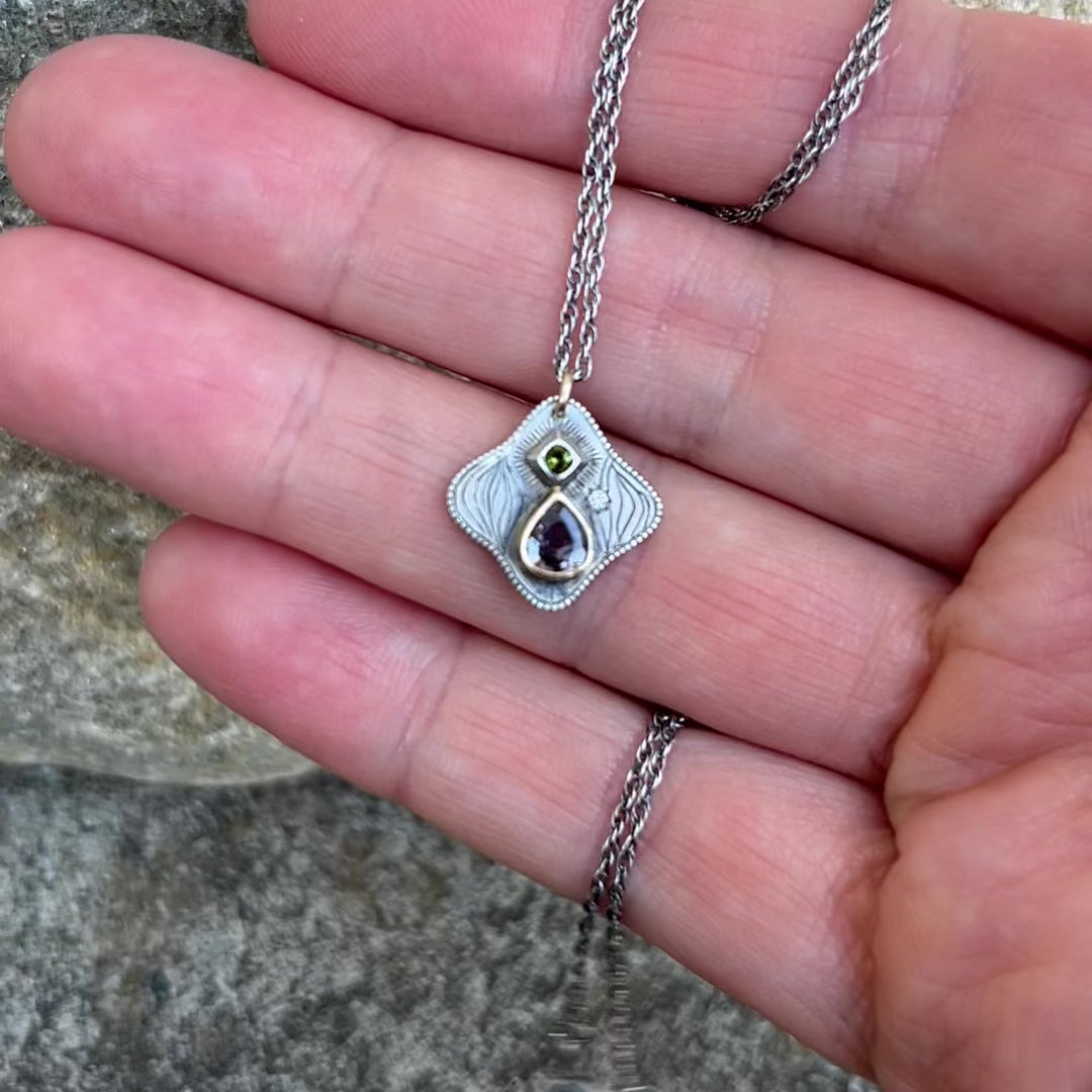 - Pear cut purple sapphire set in 14kt yellow gold. Stone has a bit of color change property. It looks pinkish purple in artificial light and more of a silver purple color in natural light. Green tourmaline accent stone. 18 inch oxidized sterling silver rope chain.