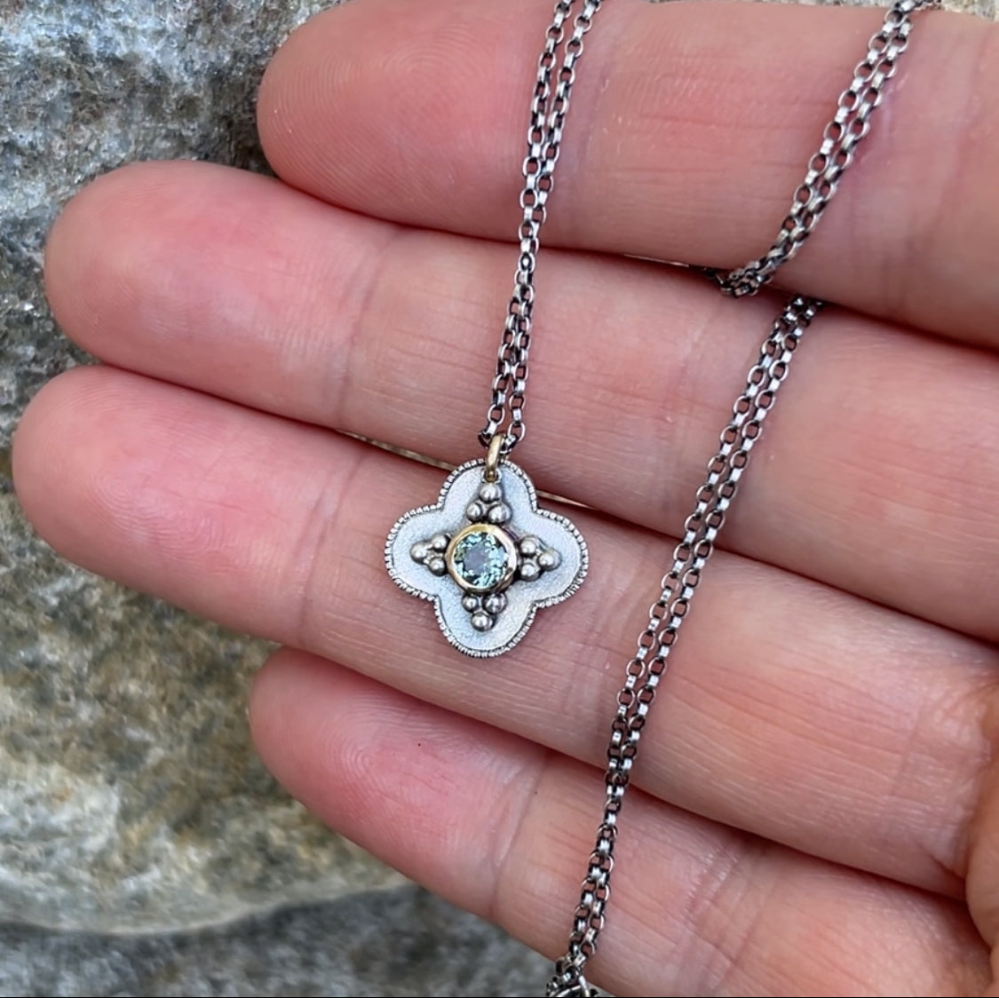 Quatrefoil Sapphire & Silver Medallion Pendant| Mixed Metal Geometric Necklace