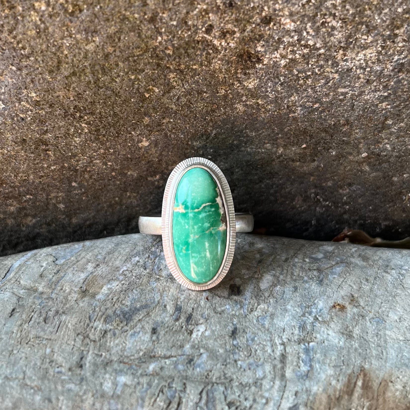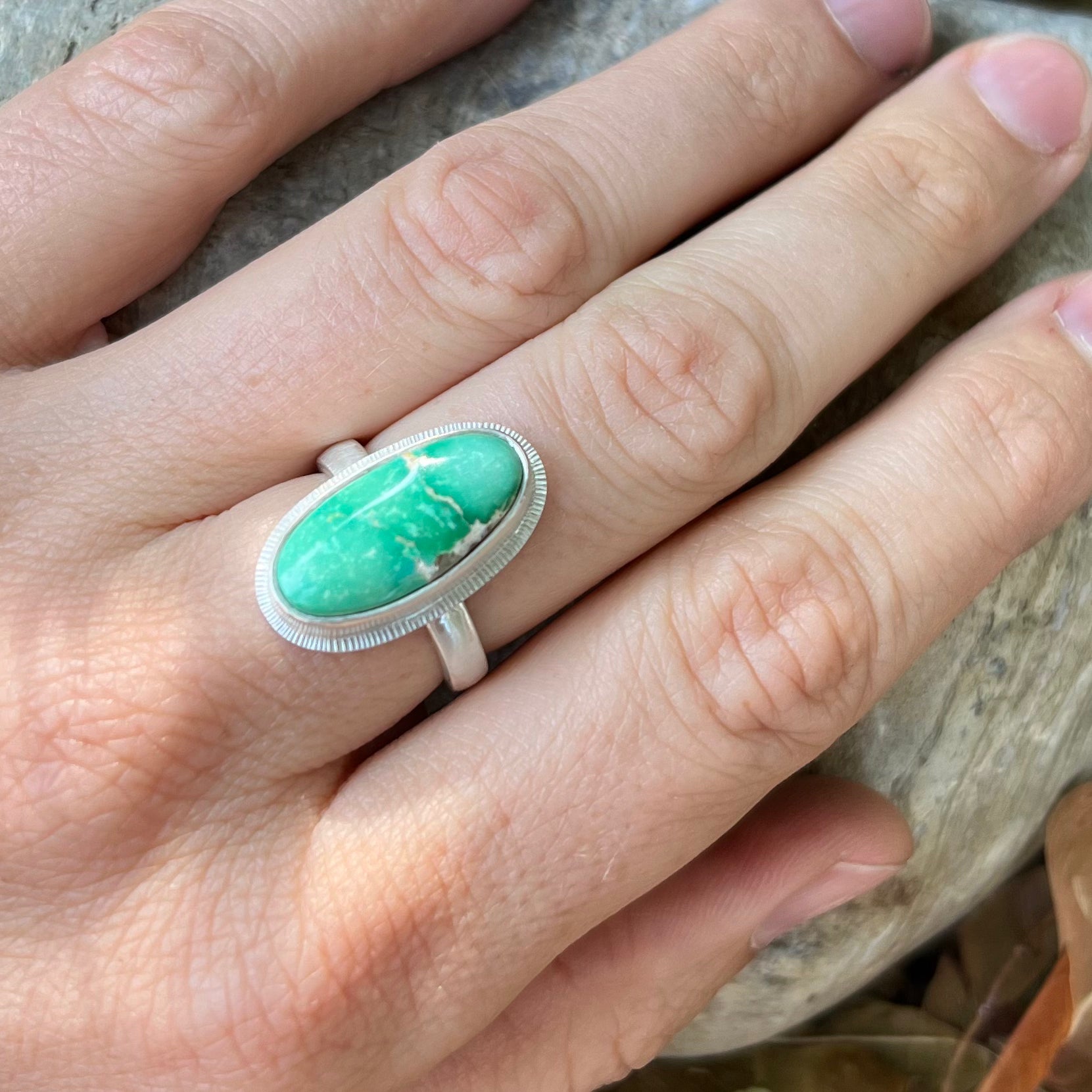 Gorgeous green turquoise with a lovely polish. Sterling silver. Size 7.5-8. Ships in 2-3 business days.