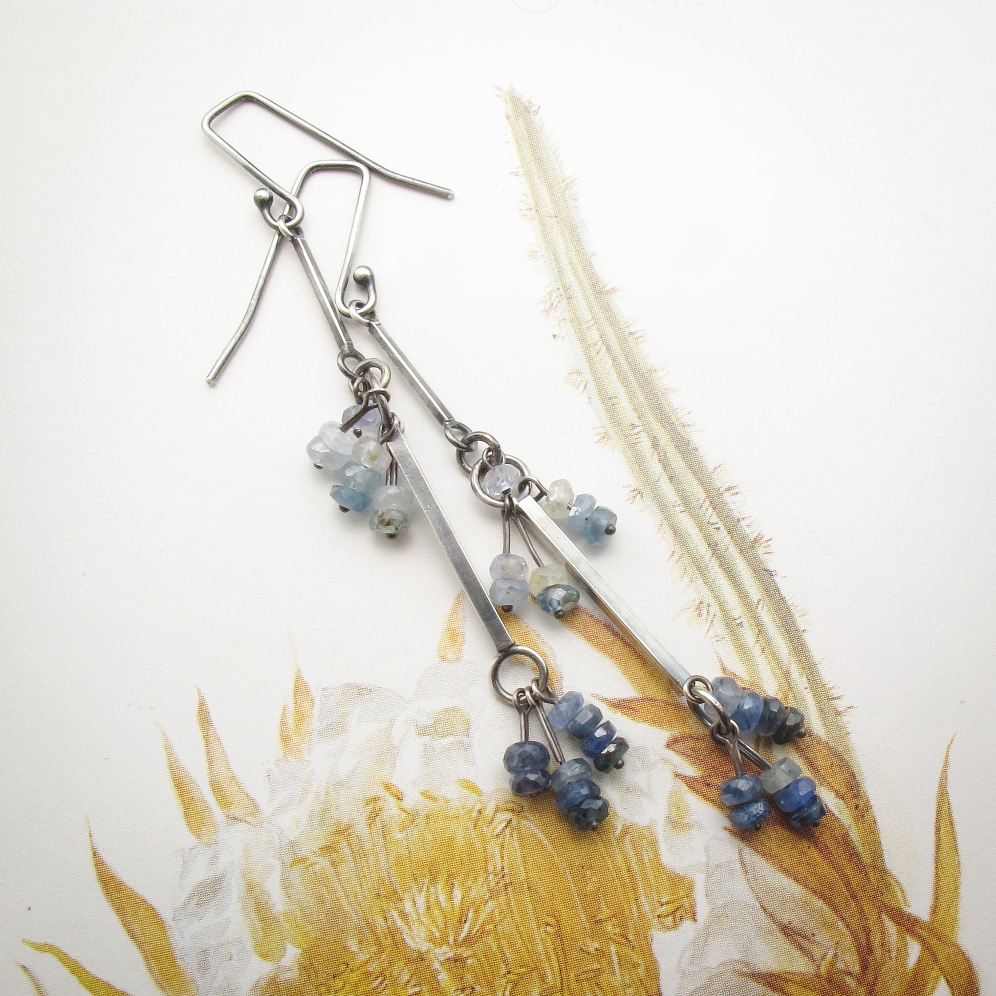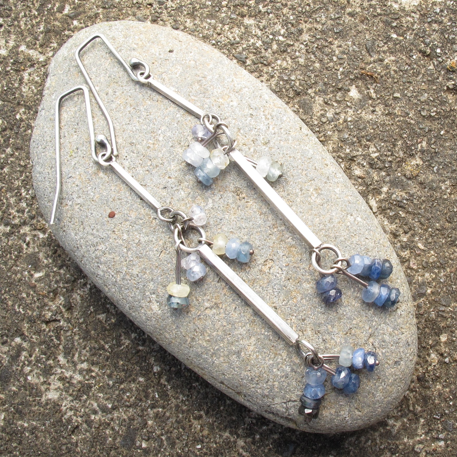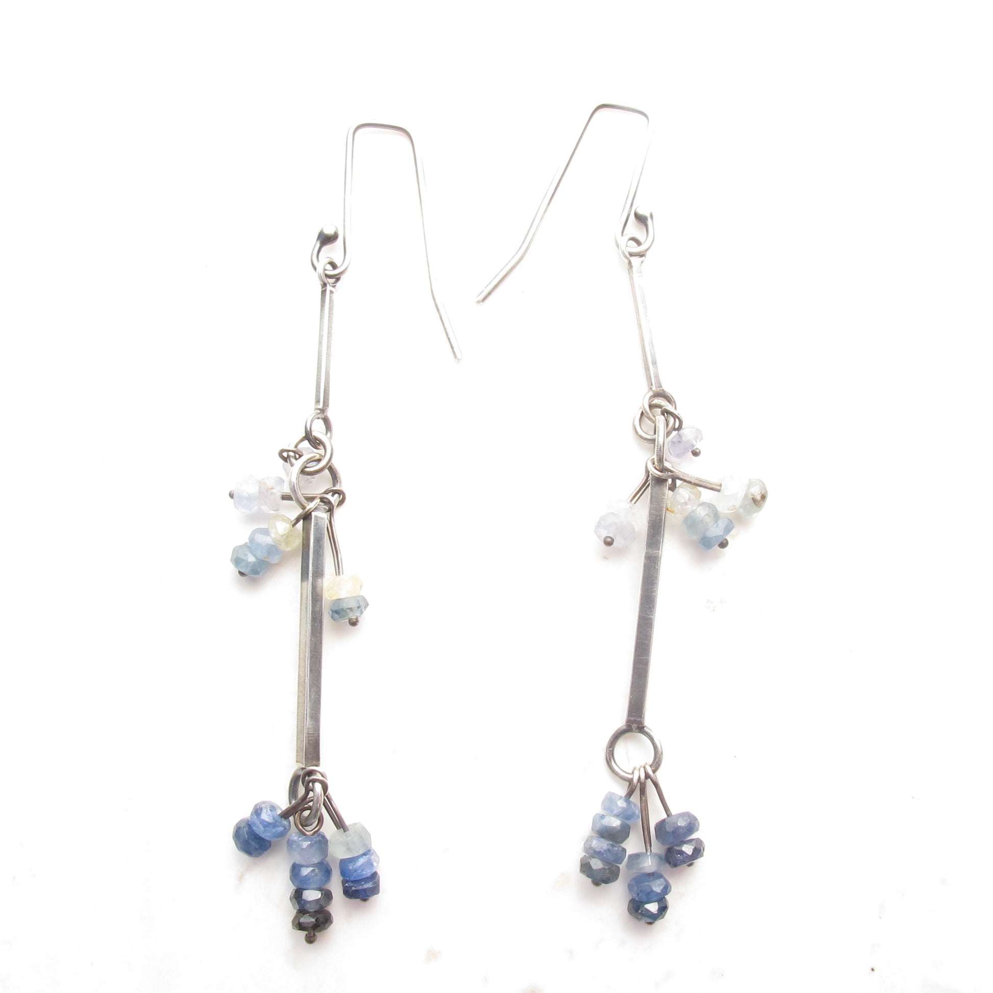 Sterling silver and sapphire earrings. Sparkling, faceted blue sapphire beads dangle from sterling silver long line drops. Lightweight and easy to wear, approximately 2.25 inches long from the bottom of the ear hook.