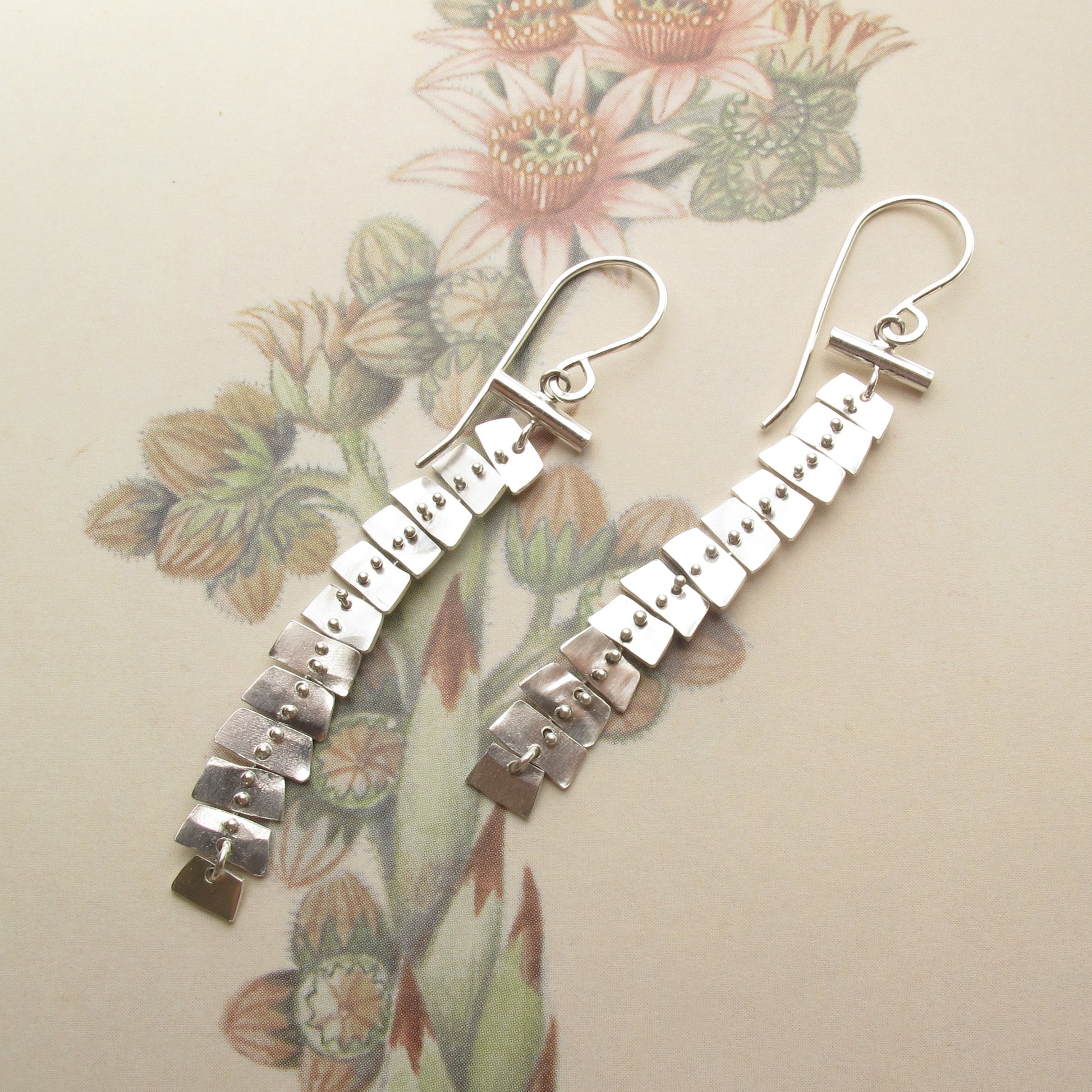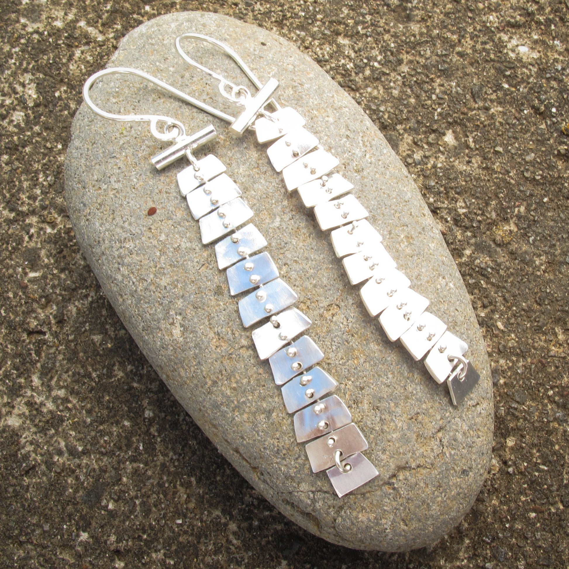 Hand formed sterling silver scales are chained together in softly undulating stream. 2.25 inches from the bottom of the ear wire.