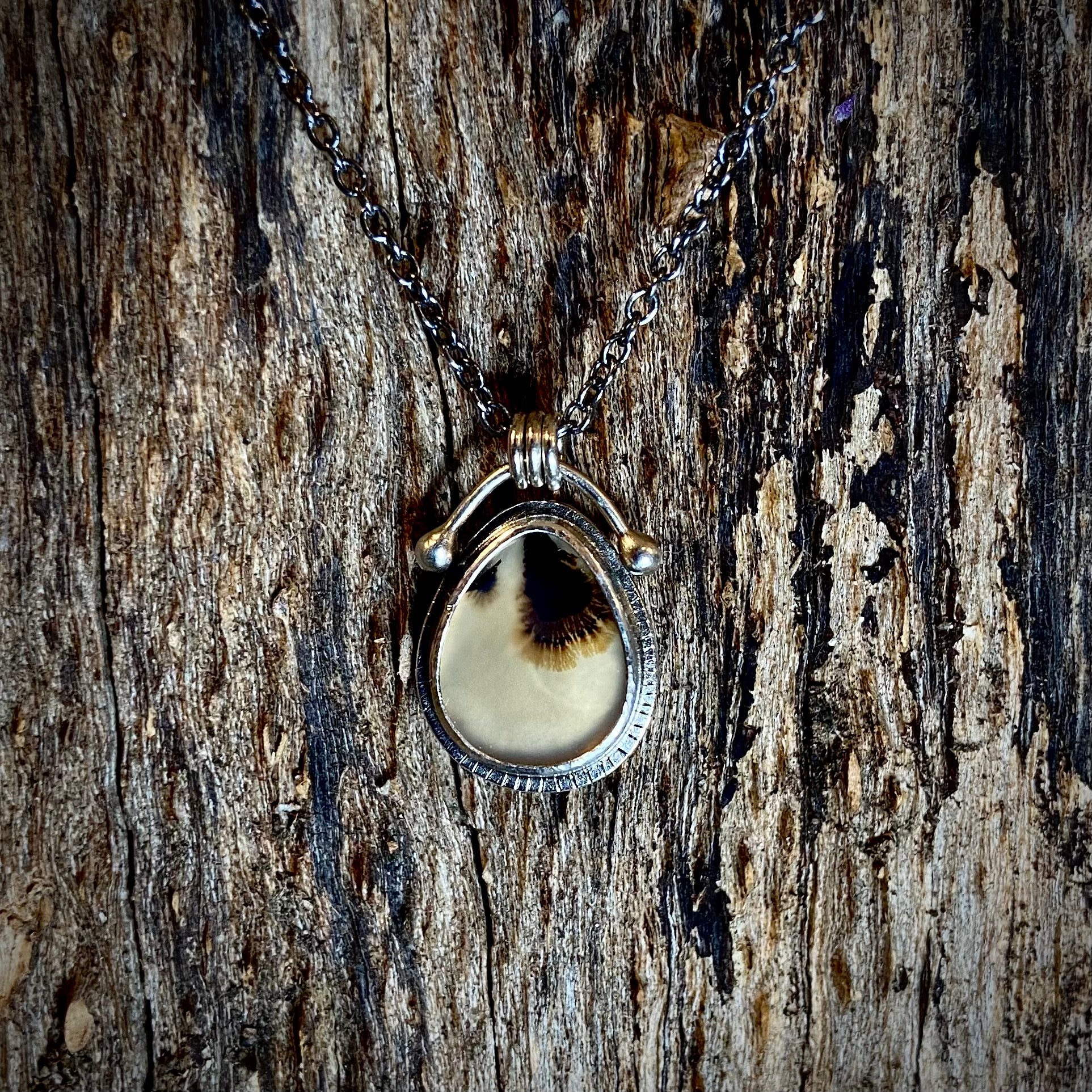 Dendritic agate and sterling silver. Oxidized solid sterling silver chain.