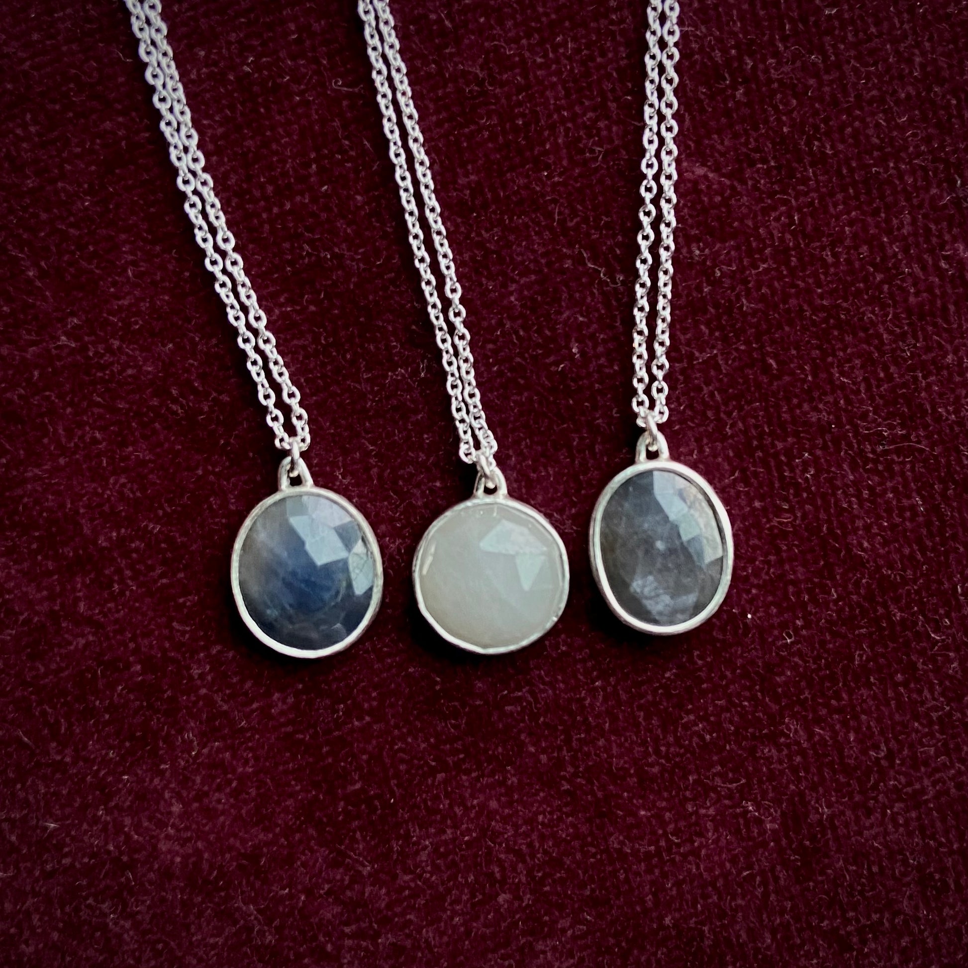 Semi-rough organic rose cut sapphires in stormy day hues. Solid sterling setting and delicate 16 inch sterling cable chain.