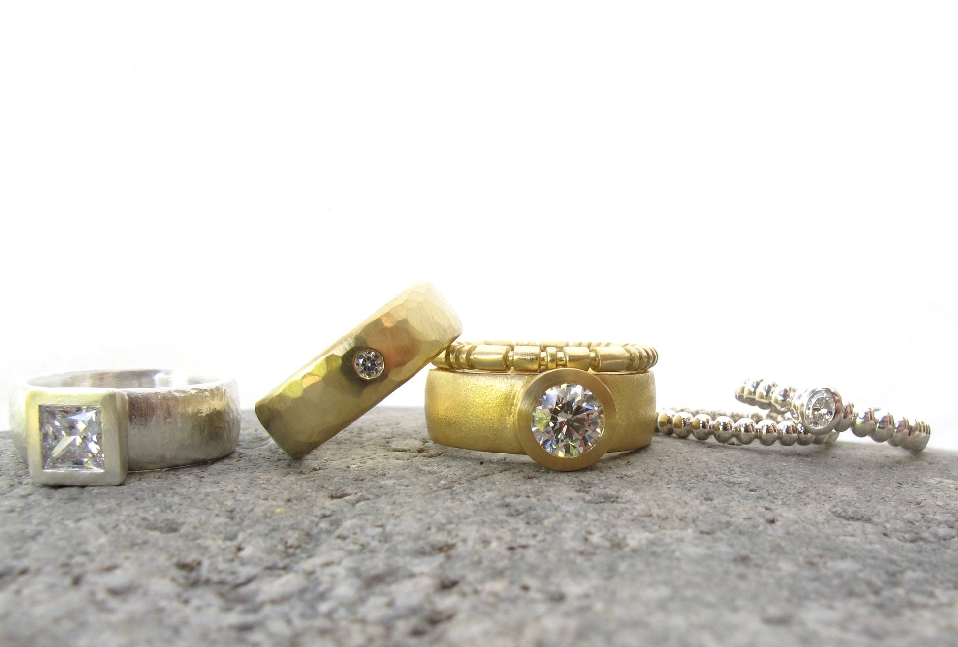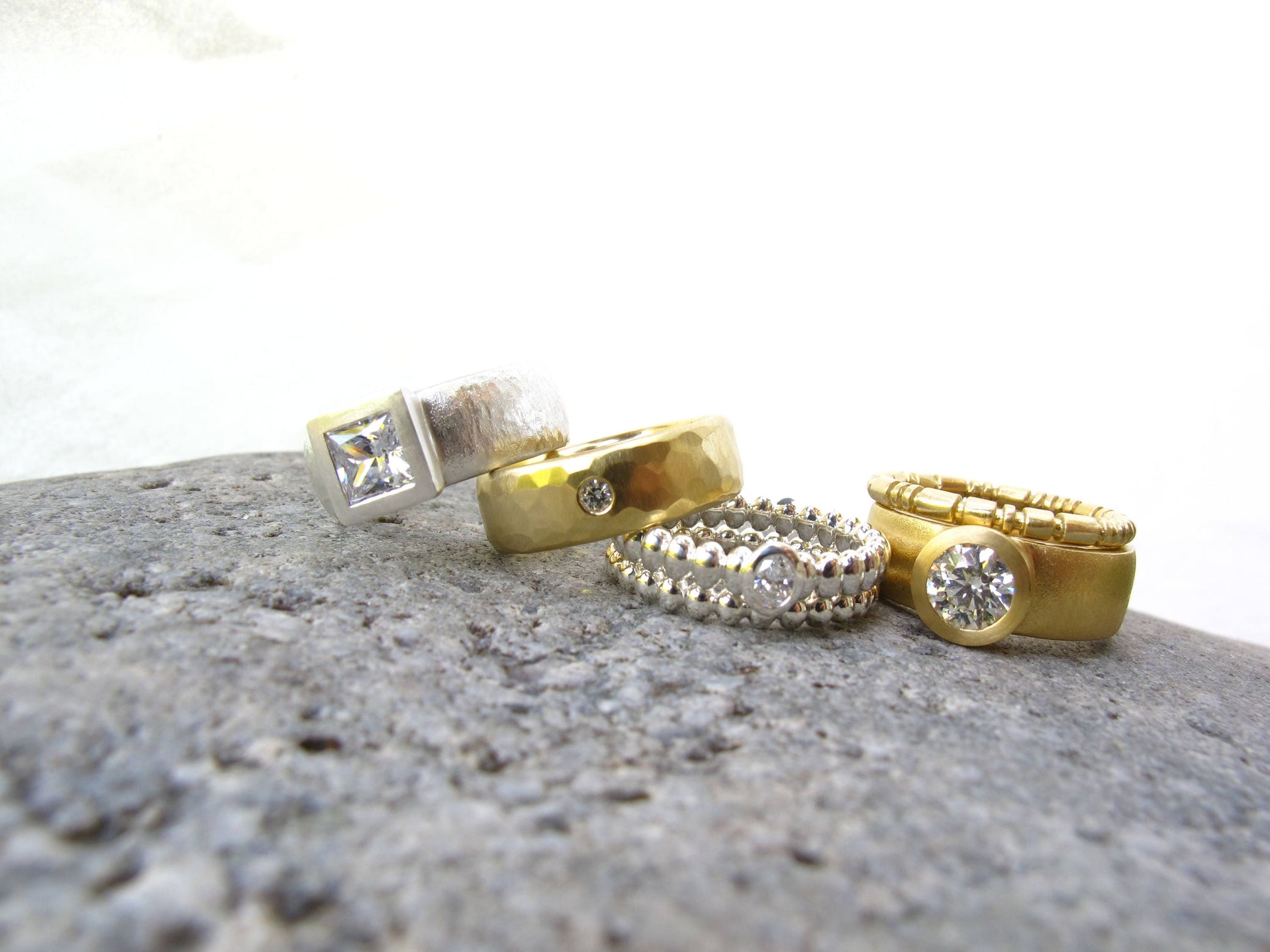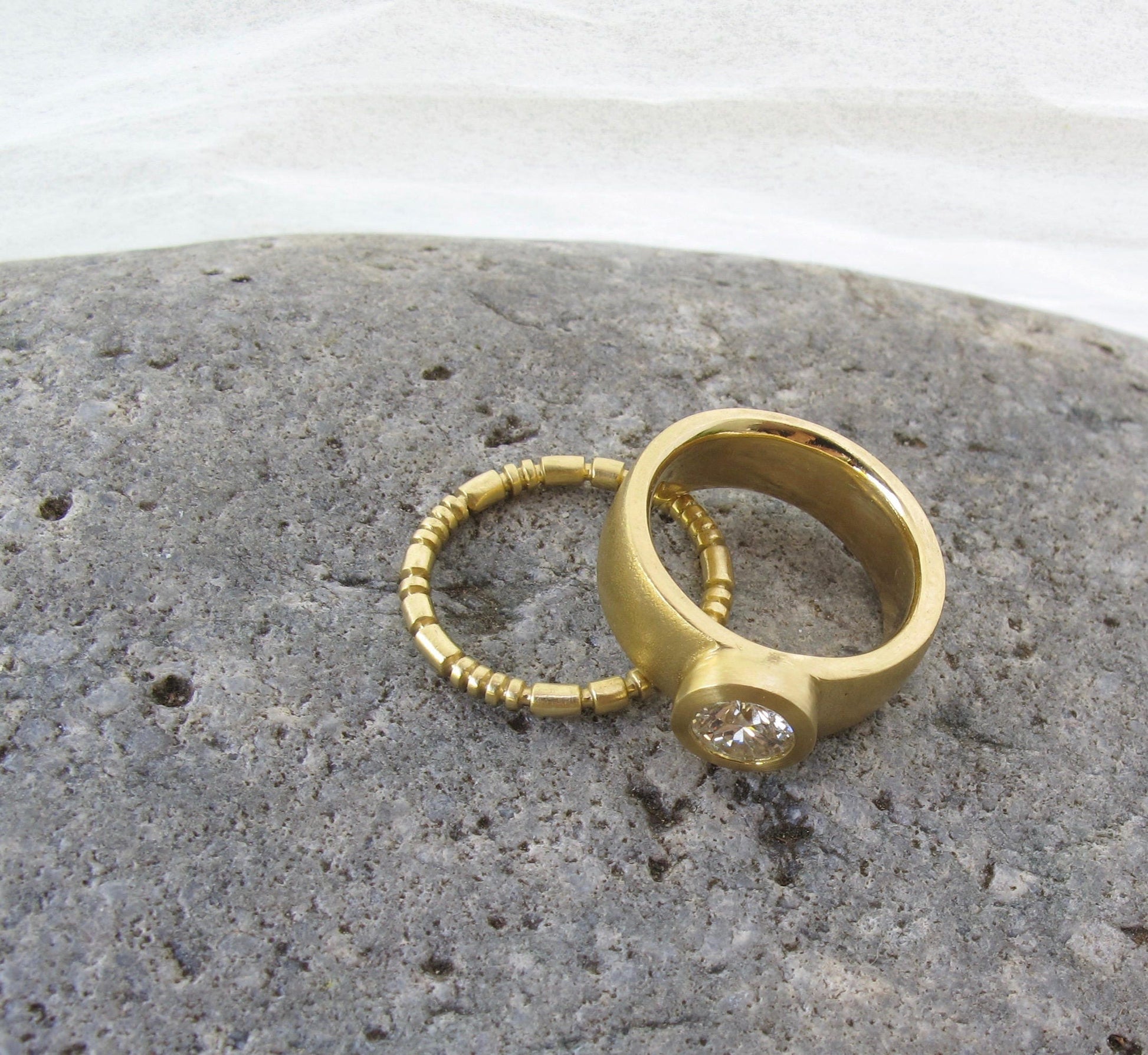 If you like a solid chunk of gold on your finger, this is the ring for you. The band is a little over 6.5mm, and weighty. Like something from an old pirate treasure box. This is actually my wedding ring, I wear mine alone most of the time. But I also pair it with the segments band shown here. This listing is for both the diamond solitaire and the wedding band.
