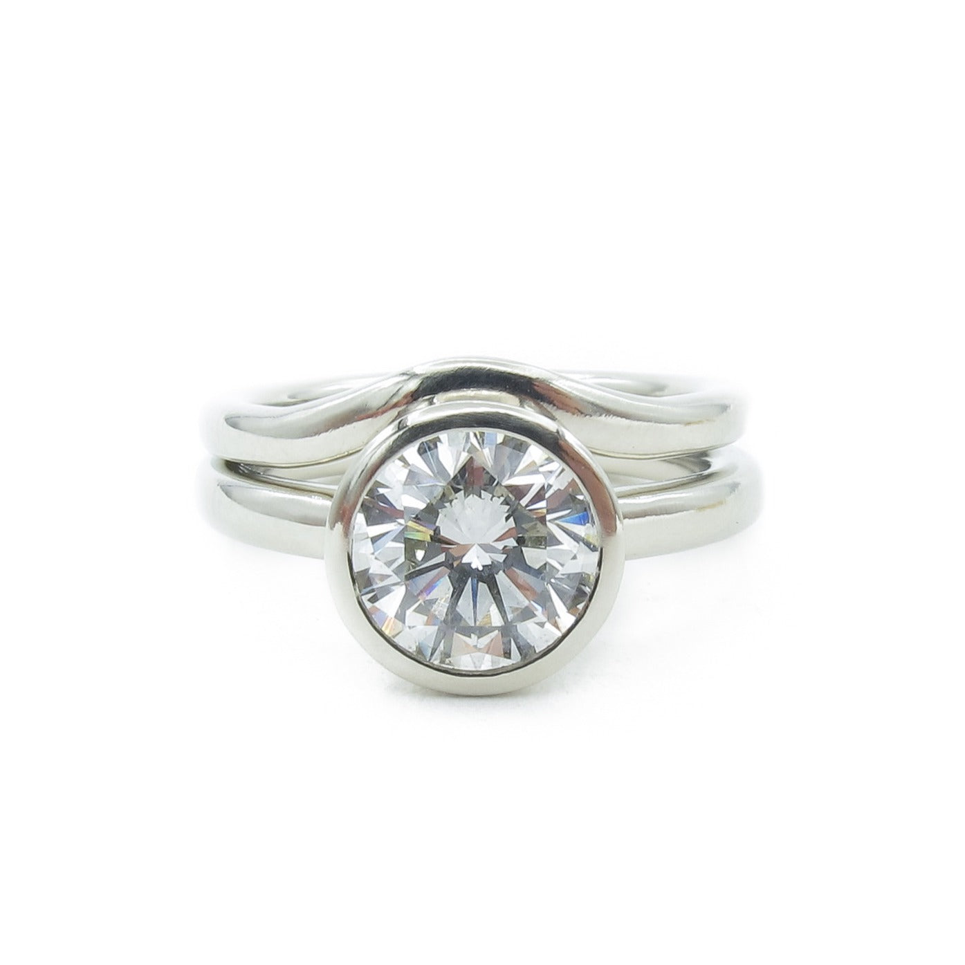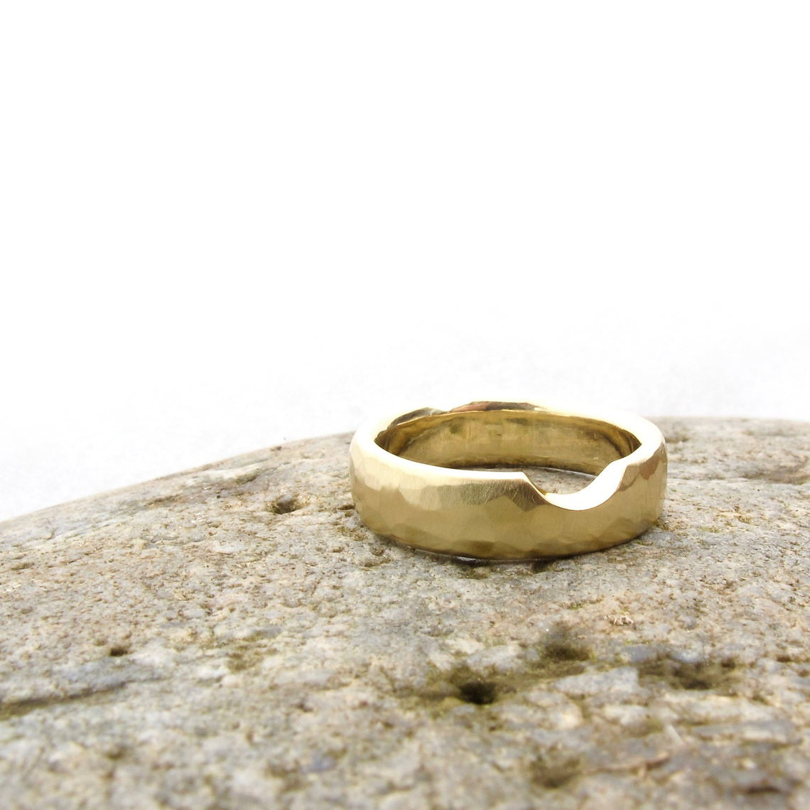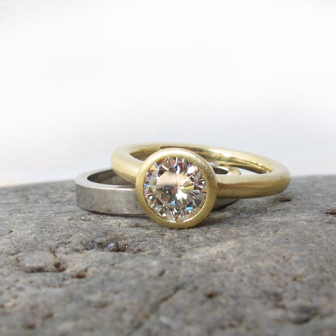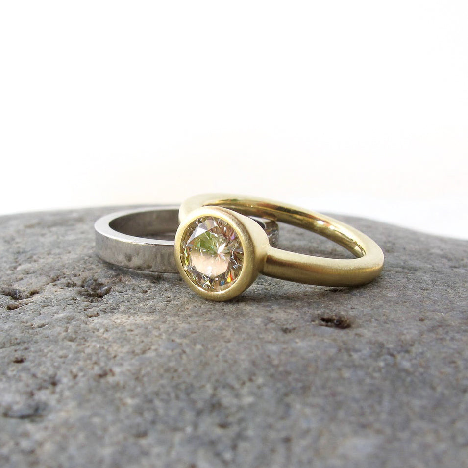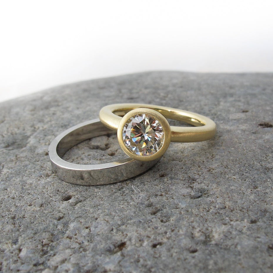 Made to order and sent empty and prepared for having your stone set locally. Shown here with a 1.1ct diamond. Band is approx. 2.5mm, rounded with a comfort fit. Fits perfectly flush with my custom cut out band, with a polished notch for the bezel setting.