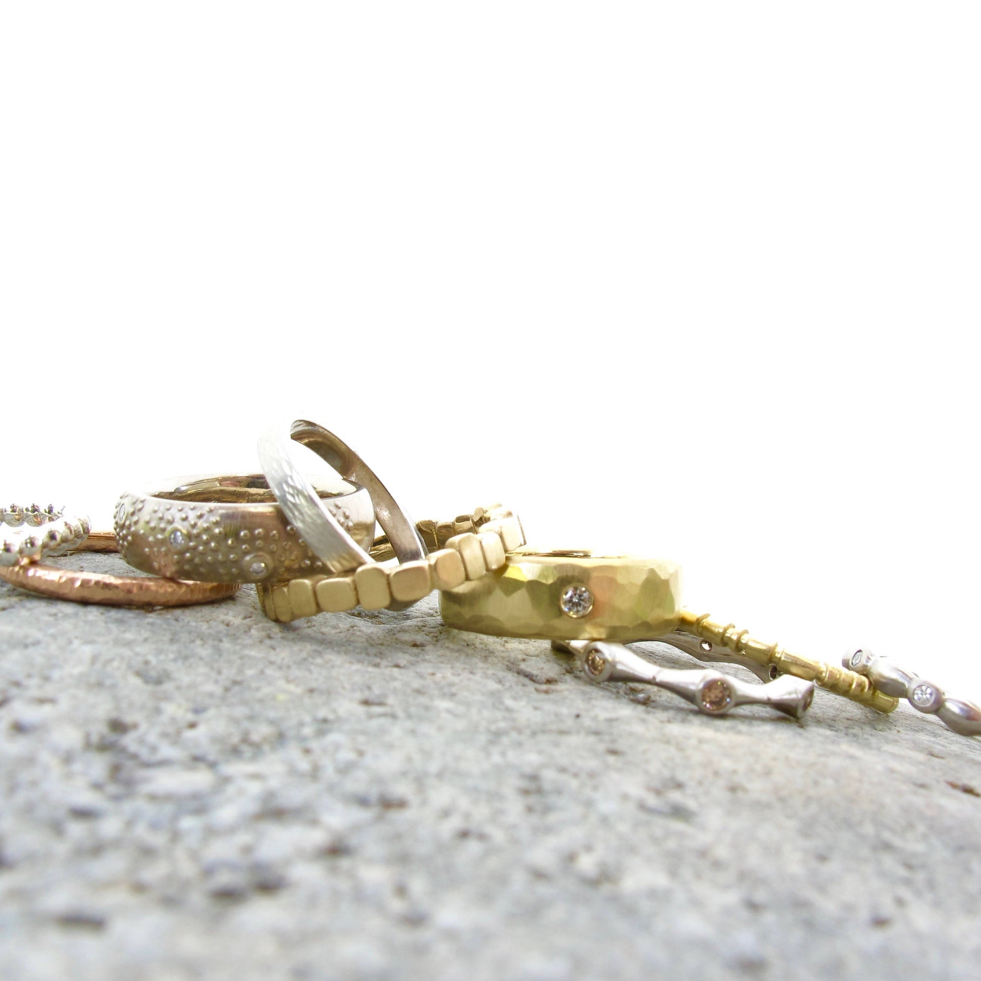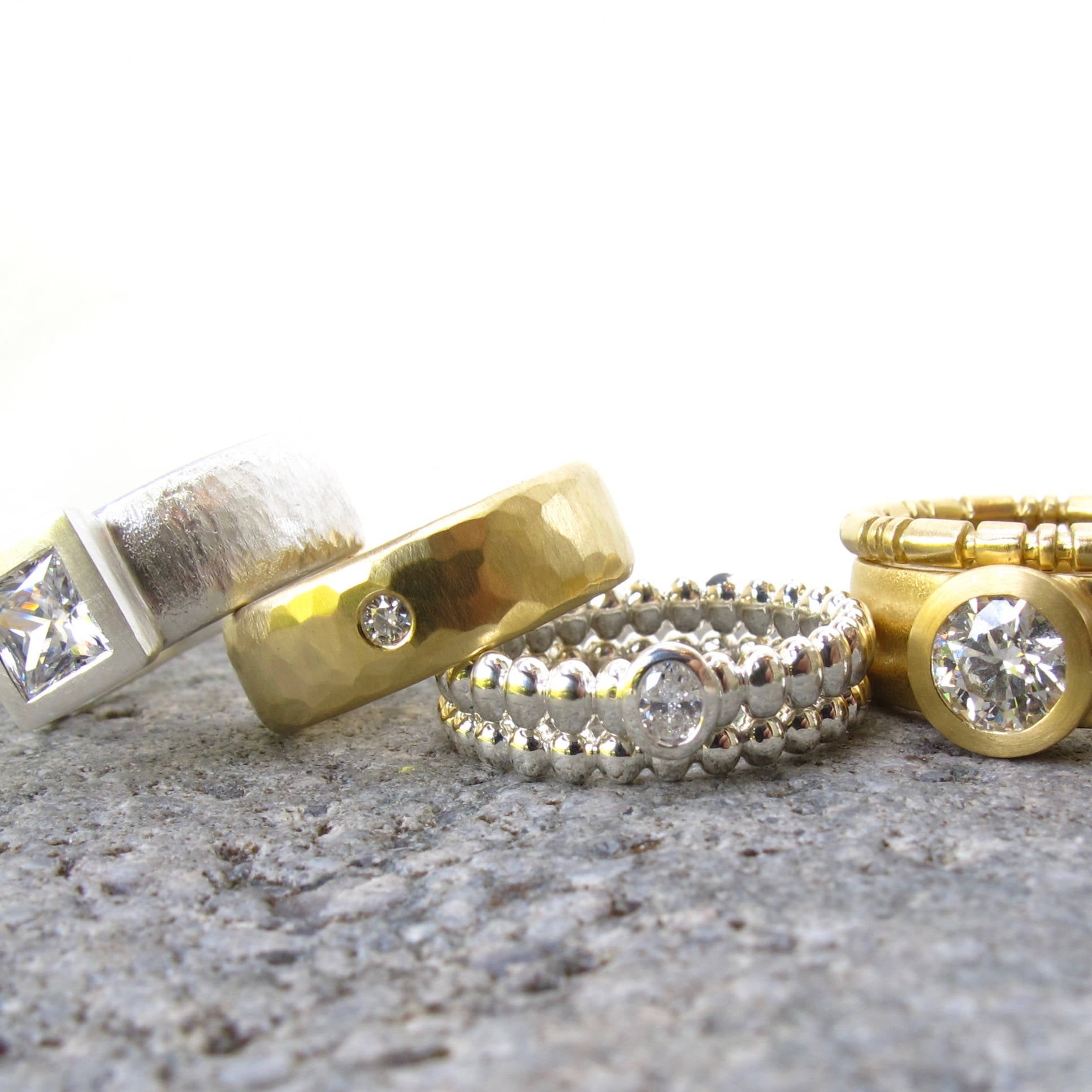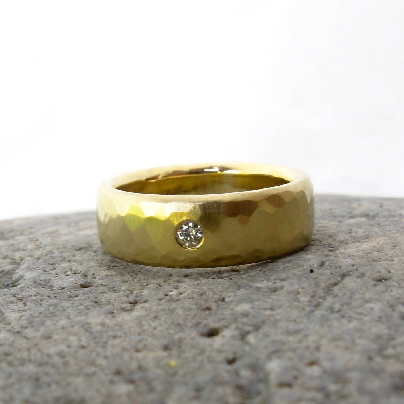 18kt recycled yellow gold. 2mm Canadian diamond. Driftwood hammered texture, satin matte finish. Low half round profile with a comfort fit inside.