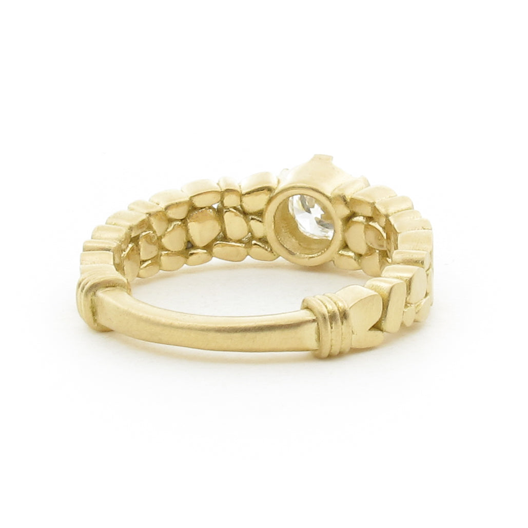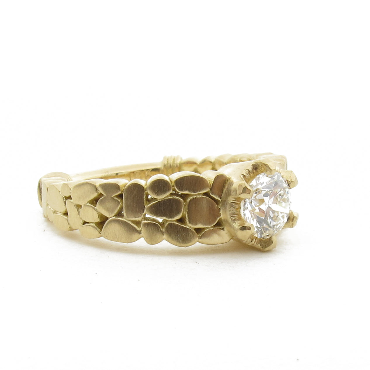 A mosaic of tiny weathered gold stones forms the band of this unique engagement ring. The diamond is the perfect wearable size, emphasizing quality over quantity.